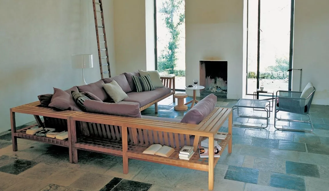 Die Kollektion Network von Roda, entworfen von Rodolfo Dordoni, markiert einen Wendepunkt im Design des Unternehmens. Diese Produktlinie zeichnet sich durch massives Teakholz und ein modulares System aus, das sich für Wohn- und Entspannungssituationen eignet. Besonders auffällig sind die Rückenlehne, die als Ablage für Accessoires dient, und die Kombination aus klaren Linien und eleganter Schlichtheit.