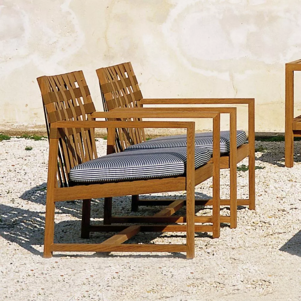 Network Outdoor Armlehnstuhl 159 von Roda Die Kollektion Network von Roda, entworfen von Rodolfo Dordoni, markiert einen Wendepunkt im Design des Unternehmens. Diese Produktlinie zeichnet sich durch massives Teakholz und ein modulares System aus, das sich für Wohn- und Entspannungssituationen eignet. Besonders auffällig sind die Rückenlehne, die als Ablage für Accessoires dient, und die Kombination aus klaren Linien und eleganter Schlichtheit. Die Kollektion umfasst Sofas, Hocker, Couchtische, Bänke, Stühle, Liegen und eine Sonnenliege mit Rädern und Teakholzleiste für Handtücher.Gestell aus Teakholz die Herstellung dieser hochwertigen Möbel erfolgt in erstklassiger Qualität UV-, witterungs- und farbbeständig leicht zu reinigen Maße: (B × T × H) 59 × 59 × 84 cm