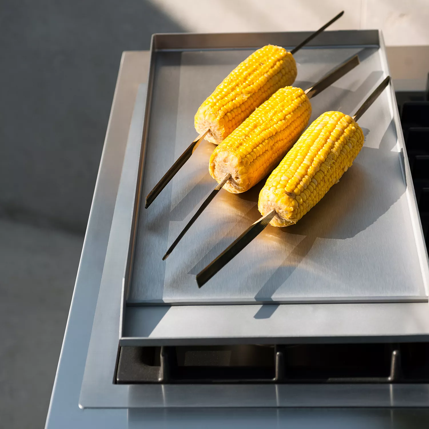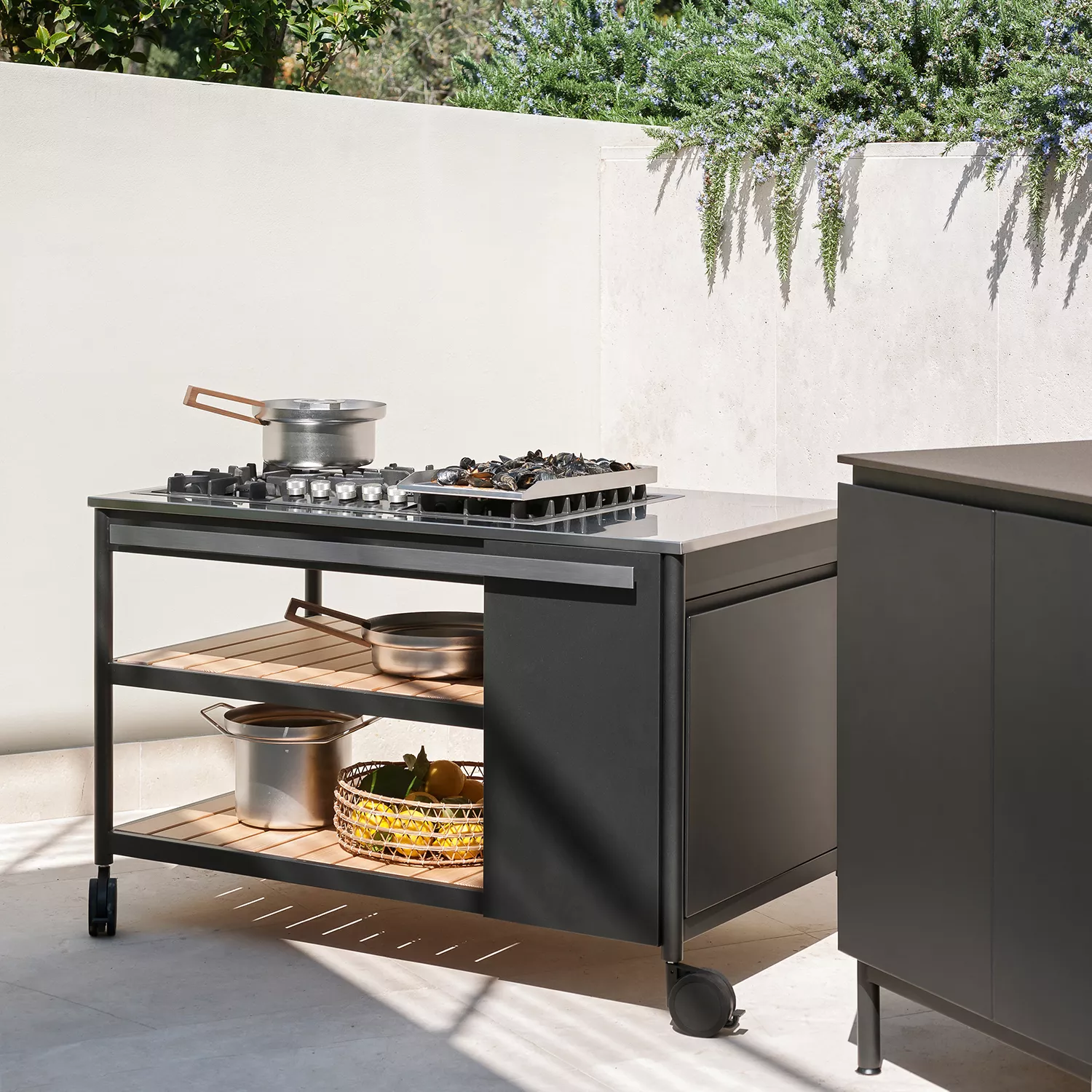 Das Kochfeld-Modul besteht aus einem Gas-Herd, das aus einem zentralen Doppelkronen-Brenner mit Dual-Technologie, zwei kleinen Frontbrennern und zwei mittleren Heckbrennern besteht. Es lässt sich frei bewegen und unter das "Anbaumodul" schieben. Die Fächer im unteren Teil des Moduls sind aus Lärchenholz gefertigt, eine praktische Stange ermöglicht das Aufhängen Ihrer Küchenutensilien. Optional erhältlich sind die Grillplatten und ein Holzschneidebrett, das perfekt auf die Arbeitsplatte passt.