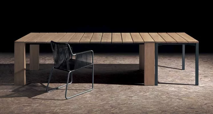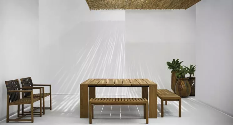 Die Kollektion Pier von Roda präsentiert einen ebenso schlichten wie faszinierenden Teakholztisch für den Außenbereich. Die Tischplatte besteht aus zahlreichen Holzleisten, die sich wie die Tasten eines Klaviers harmonisch aneinanderreihen. Diese Leisten sind leicht versetzt angeordnet, so dass der Eindruck einer endlosen Linie entsteht. Plötzlich steigen sie vertikal an und bilden die Beine des Tisches, wodurch ein einzigartiges und dynamisches Design entsteht. Pier verbindet schlichte Eleganz mit innovativem Design und ist eine stilvolle Bereicherung für jeden Außenbereich.