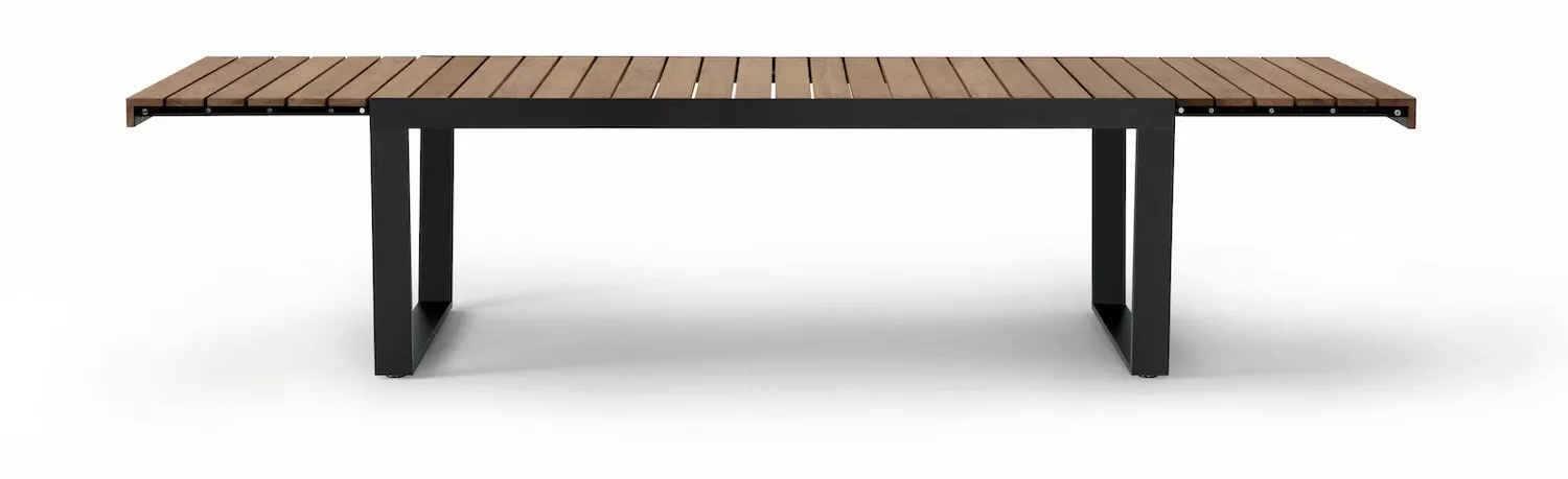Roda Brick Ausziehtisch 300/240 cm aus Teakholz Collection Brick • Design: Gordon Guillaumier Der Esstisch Roda Brick besteht aus einem robusten Teakholzrahmen. Teakholz enthält eine natürliche ölhaltige Substanz, die es äußerst widerstandsfähig gegen Witterungseinflüsse, Temperaturschwankungen, Schädlinge und Insekten macht. Im Freien bildet sich auf der Oberfläche eine 1-2 mm dicke Oxidationspatina, die dem Holz eine silbergraue Farbe verleiht. Diese Patina beeinträchtigt nicht die ursprünglichen Eigenschaften des Holzes und kann durch richtige Pflege vermieden oder entfernt werden. Der Esstisch Roda Brick verbindet somit ästhetische Eleganz mit dauerhafter Funktionalität. Material: Teakholz Butterfly-System UV-, witterungs- und farbbeständig Leichte Reinigung Maße: B300/240 x T100 x H75 cm Gewicht: 175/160 kg
