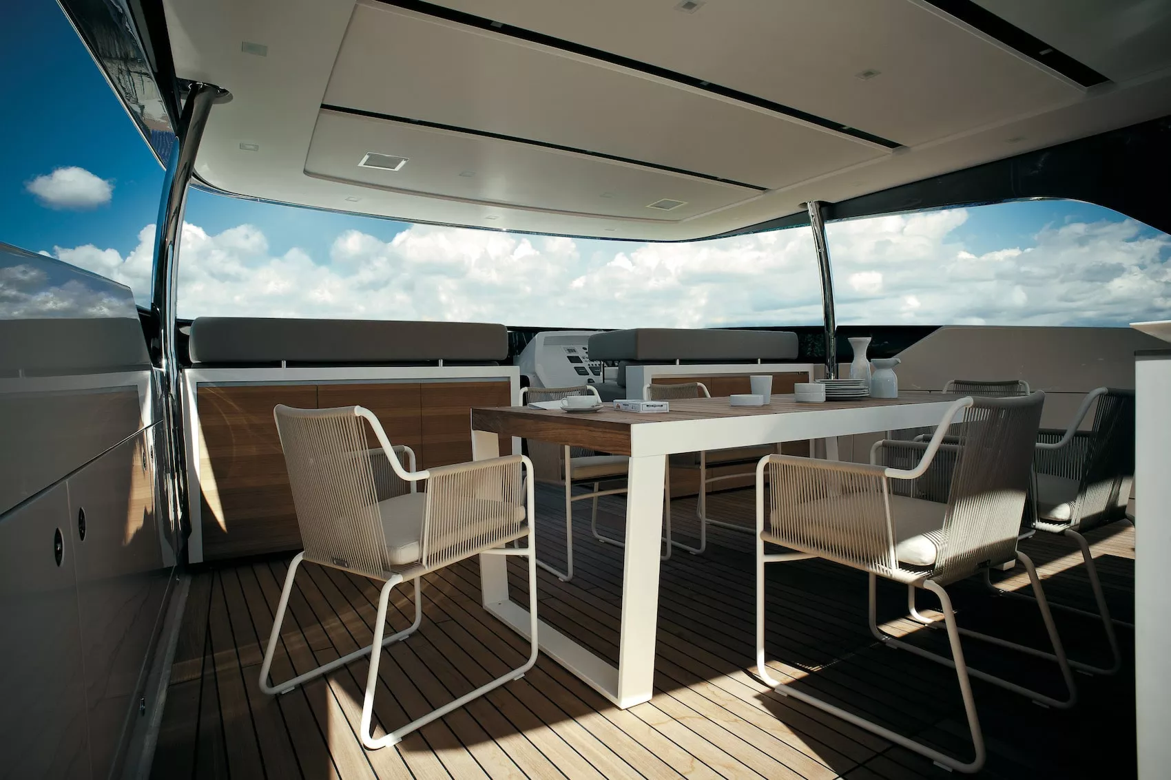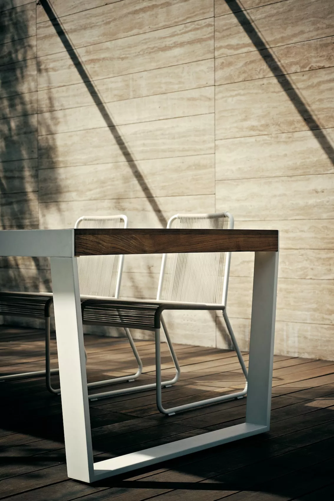 Der Spinnaker Tisch zeichnet sich durch einen Klappmechanismus aus, bei dem die robuste, aus Latten bestehende Tischplatte entlang der Führungsschienen verschoben wird. Erhältlich ist die Platte in natürlichem Teak oder wetterbeständig weiß lackiertem Finish. Die geometrischen, durchgehenden Beine aus lackiertem Edelstahl sorgen für Stabilität und modernes Flair und sind ideal für den Einsatz im Freien geeignet.