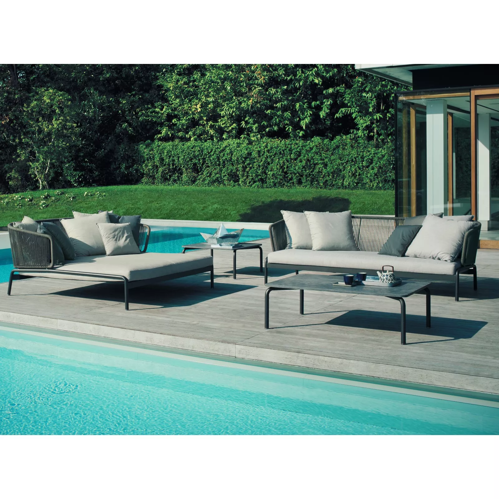 Roda Spool Loungesofa 002 • Geflecht Ø 7 mm Das originelle Design betont die ausgeprägte geradlinige Geometrie der zeitlosen Roda Spool Kollektion. Der leichte und gleichzeitig widerstandsfähige Edelstahl eignet sich hervorragend für das Spool Loungemöbel Gestell, das mit einem robusten Kunststoffgeflecht bezogen ist. Die Spool Kollektion zeigt eine gelungene Kombination der natürlichen und hochtechnologischen Materialien, die für die Gestaltung der originellen Outdoorlösungen perfekt geeignet sind. Die Roda Spool Outdoor Kollektion verwandelt jeden Raum sehr raffiniert zu einem fortschrittlichen und komfortablen Sitzbereich. Kollektion Spool von RODA ist ein Projekt, dass sich durch die formale Einfachheit auszeichnet und besteht aus Gartenmöbeln, die elegant und anspruchsvoll Ihren Innen- und Außenbereich vervollständigen. Die robuste pulverbeschichtete Edelstahlstruktion mit der strengen Linie der Rückenlehnen und Sitze wird mit dem absoluten Komfort der Polster verbunden. Gestell: Edelstahl, pulverbeschichtet Bespannung: Cord (Polyester-Geflecht, Ø 7 mm), Belt (Schlauchpolsterung aus Polyester) oder Batyline (durchgehende Stoffbespannung) Sitzhöhe (ohne Kissen): 27 cm Armlehnhöhe: 79 cm inkl. Sitz- und Rückenkissen (optional "wasserfest") UV-, witterungs- und farbbeständig leichte Reinigung Maße: B182 x T94 x H79 cm Gewicht: 25 kg