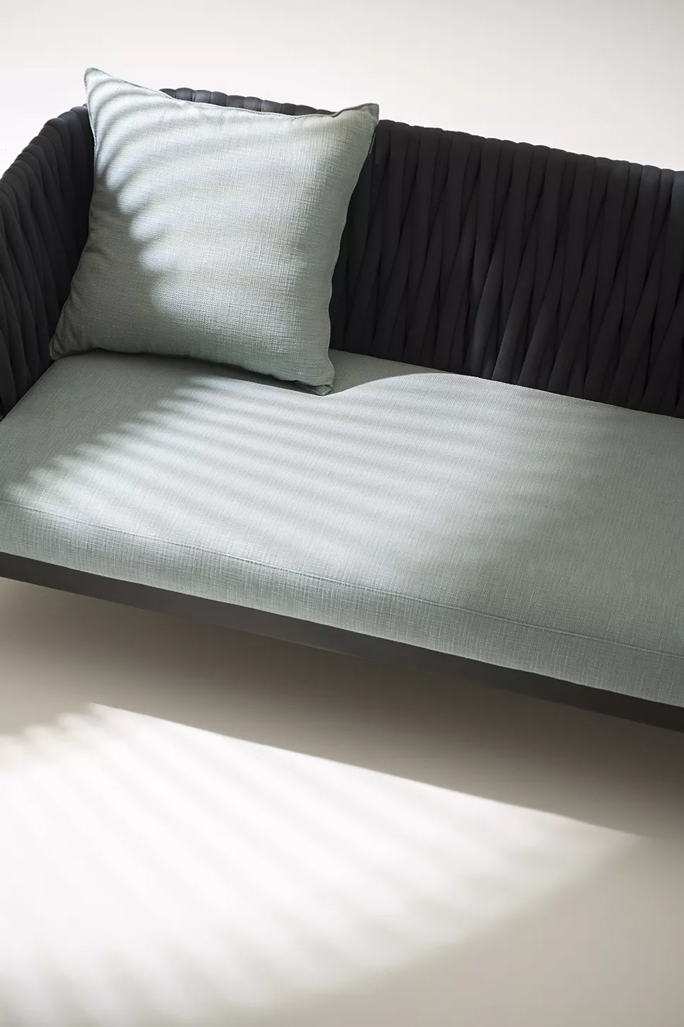 Roda Spool Loungesofa 001 • Geflecht Ø 7 mm Das originelle Design betont die ausgeprägte geradlinige Geometrie der zeitlosen Roda Spool Kollektion. Der leichte und gleichzeitig widerstandsfähige Edelstahl eignet sich hervorragend für das Spool Loungemöbel Gestell, das mit einem robusten Kunststoffgeflecht bezogen ist. Die Spool Kollektion zeigt eine gelungene Kombination der natürlichen und hochtechnologischen Materialien, die für die Gestaltung der originellen Outdoorlösungen perfekt geeignet sind. Die Roda Spool Outdoor Kollektion verwandelt jeden Raum sehr raffiniert zu einem fortschrittlichen und komfortablen Sitzbereich. Kollektion Spool von RODA ist ein Projekt, dass sich durch die formale Einfachheit auszeichnet und besteht aus Gartenmöbeln, die elegant und anspruchsvoll Ihren Innen- und Außenbereich vervollständigen. Die robuste pulverbeschichtete Edelstahlstruktion mit der strengen Linie der Rückenlehnen und Sitze wird mit dem absoluten Komfort der Polster verbunden. Gestell: Edelstahl, pulverbeschichtet Bespannung: Cord (Polyester-Geflecht, Ø 7 mm), Belt (Schlauchpolsterung aus Polyester) oder Batyline (durchgehende Stoffbespannung) Sitzhöhe (ohne Kissen): 27 cm Armlehnhöhe: 79 cm inkl. Sitz- und Rückenkissen (optional "wasserfest") UV-, witterungs- und farbbeständig leichte Reinigung Maße: B90/106 x T94 x H79 cm Gewicht: 19 kg