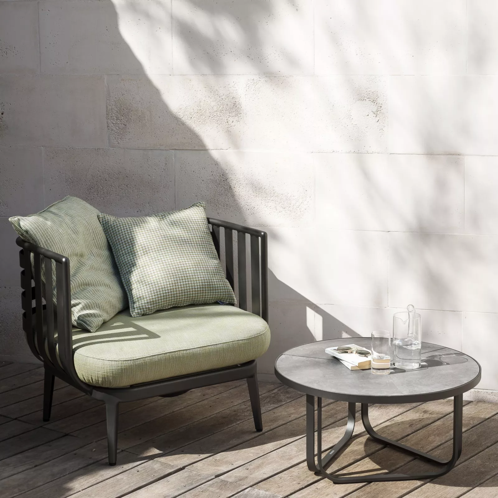 Kollektion THEA von RODA ist ein Projekt, das sich durch die extreme formale Einfachheit auszeichnet und besteht aus gemütlichen Loungemöbeln und schönen Tischen mit verschiedenfarbigen Tischplatten, die elegant und anspruchsvoll Ihren Innen- und Außenbereich vervollständigen. Die robuste pulverbeschichtete Aluminiumkonstruktion mit der strengen Linie der Rückenlehnen und Sitze wird mit dem absoluten Komfort der Polster verbunden. Loungegruppe THEA wird mit Aluminiumgestell in Rauch- oder Rostfarbe gefertigt.