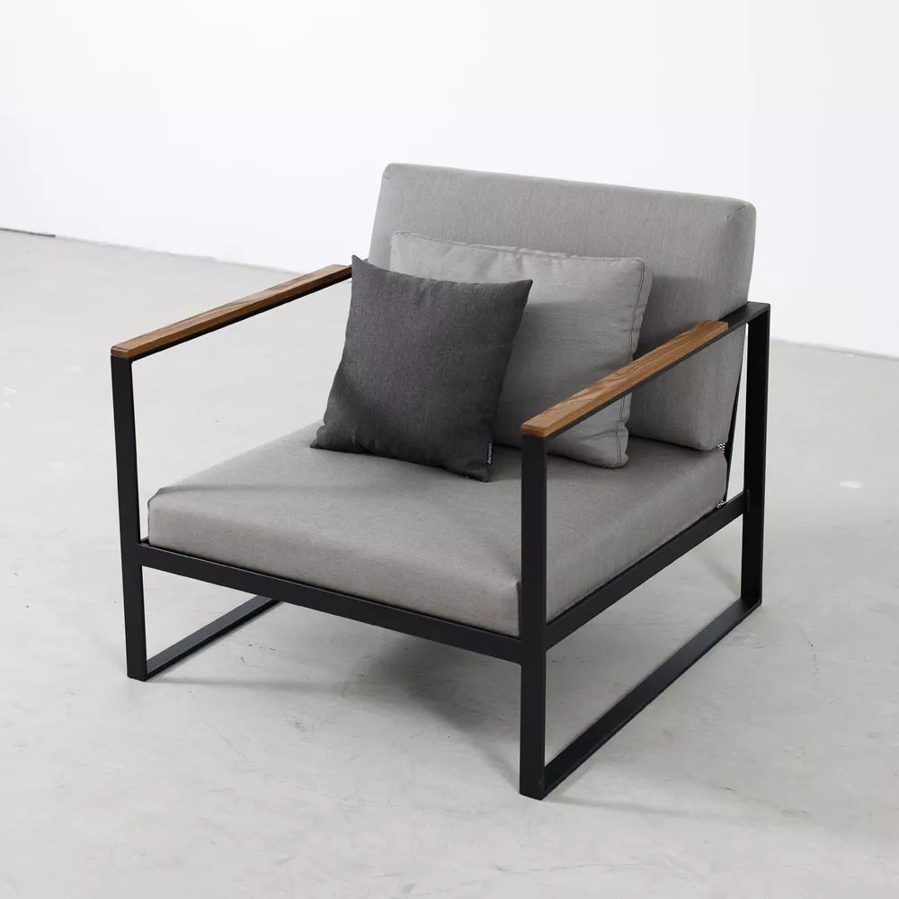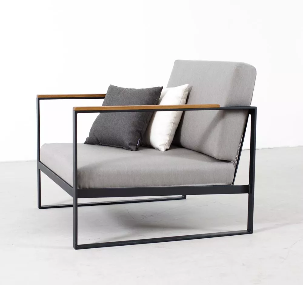 Materials: Teak, Stainless steel coated in Akzo Nobel anthracite powder coating. Pillows in weather resistant sunbrella material.