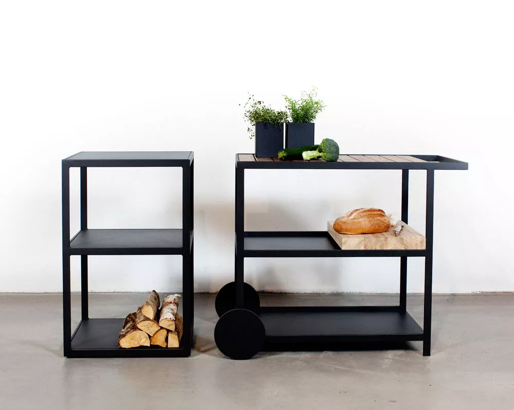 Der Gartenservierwagen ist ein robuster Wagen aus pulverbeschichtetem Stahl und hitzebehandelter Esche. Er ist mit zwei Stahlfächern ausgestattet, das obere Fach ist aus Esche und die Räder sind aus Stahl. Der Wagen bietet eine perfekte Arbeitsfläche und Aufbewahrungsmöglichkeiten für Ihr Outdoor-Kochen.