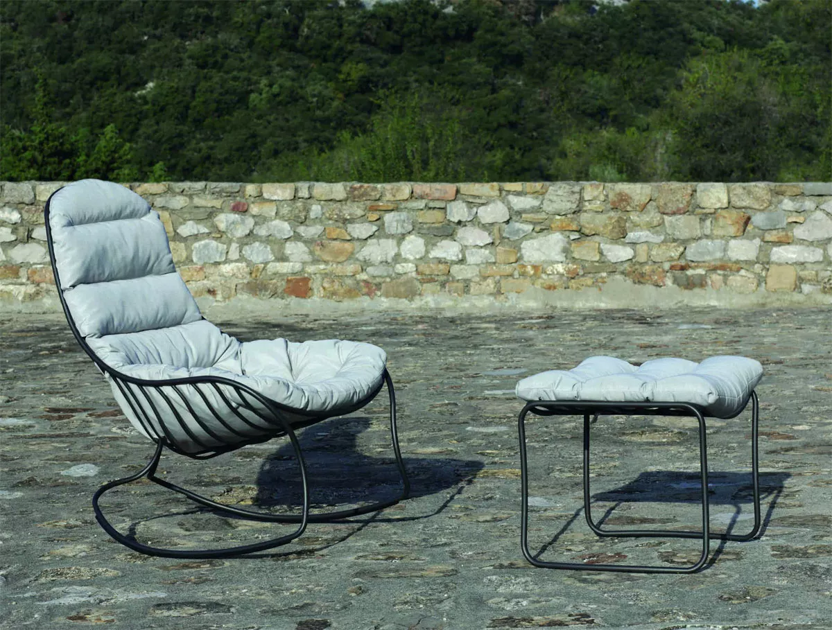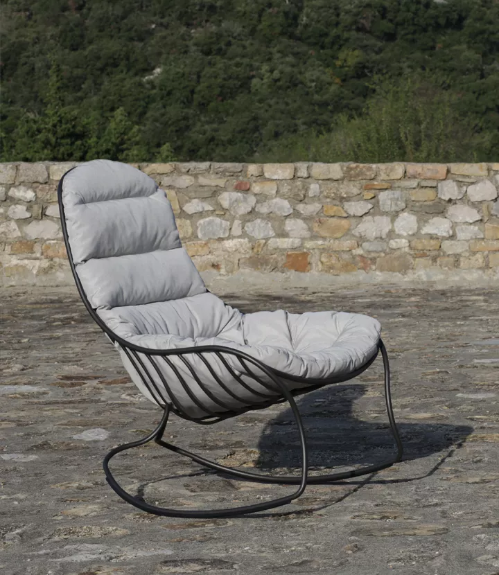 Schaukelstuhl Folia aus Edelstahl Weiß oder Bronze beschichtet, erhältlich mit einem Sitzkissen in verschiedenen Farben.