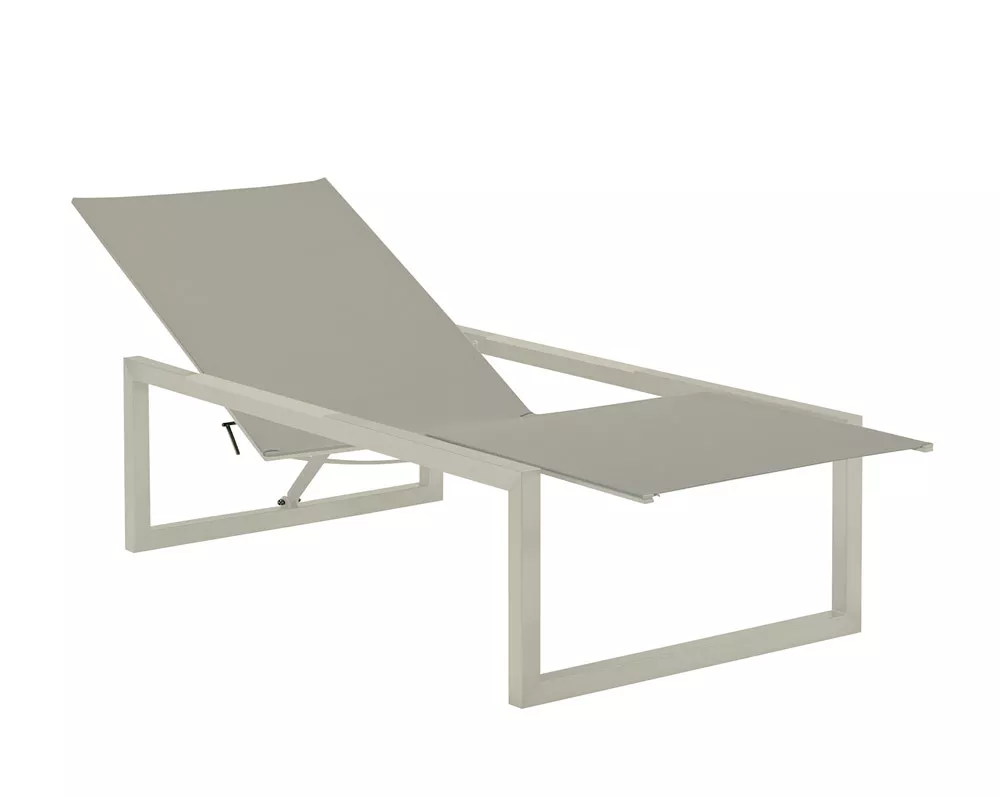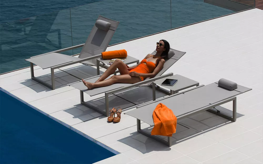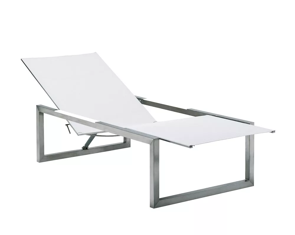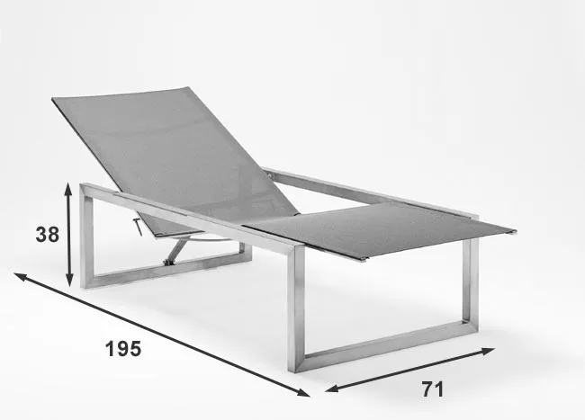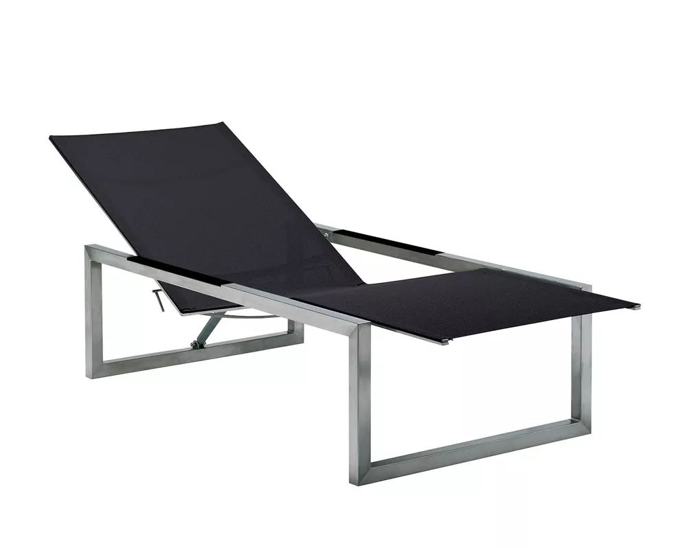 Die Sonnenliege Ninix mit Batyline-Bespannung, erhältlich in verschiedenen Farben. Die Sonnenliege ist kann wahlweise mit elektropoliertem Gestell bestellt werden und eignet sich dadurch hervorragend für den Einsatz im maritimen Bereich.