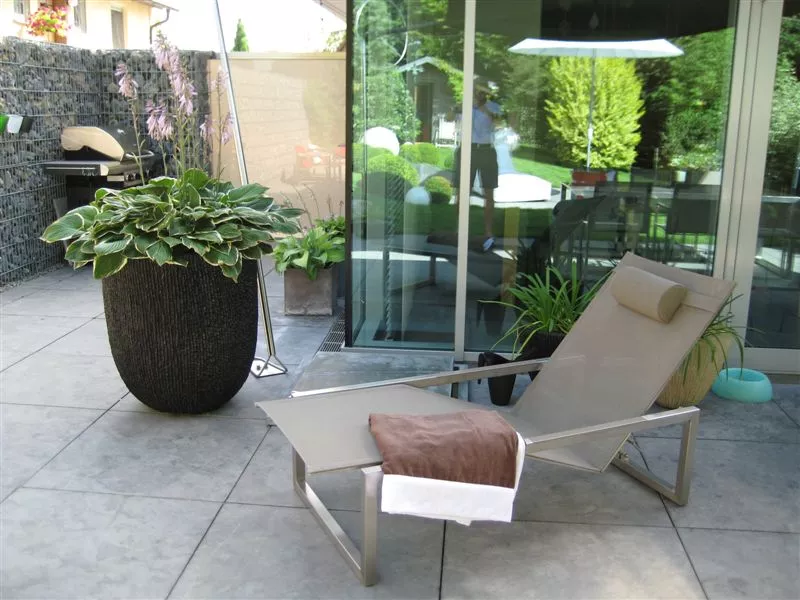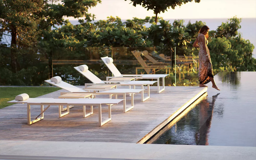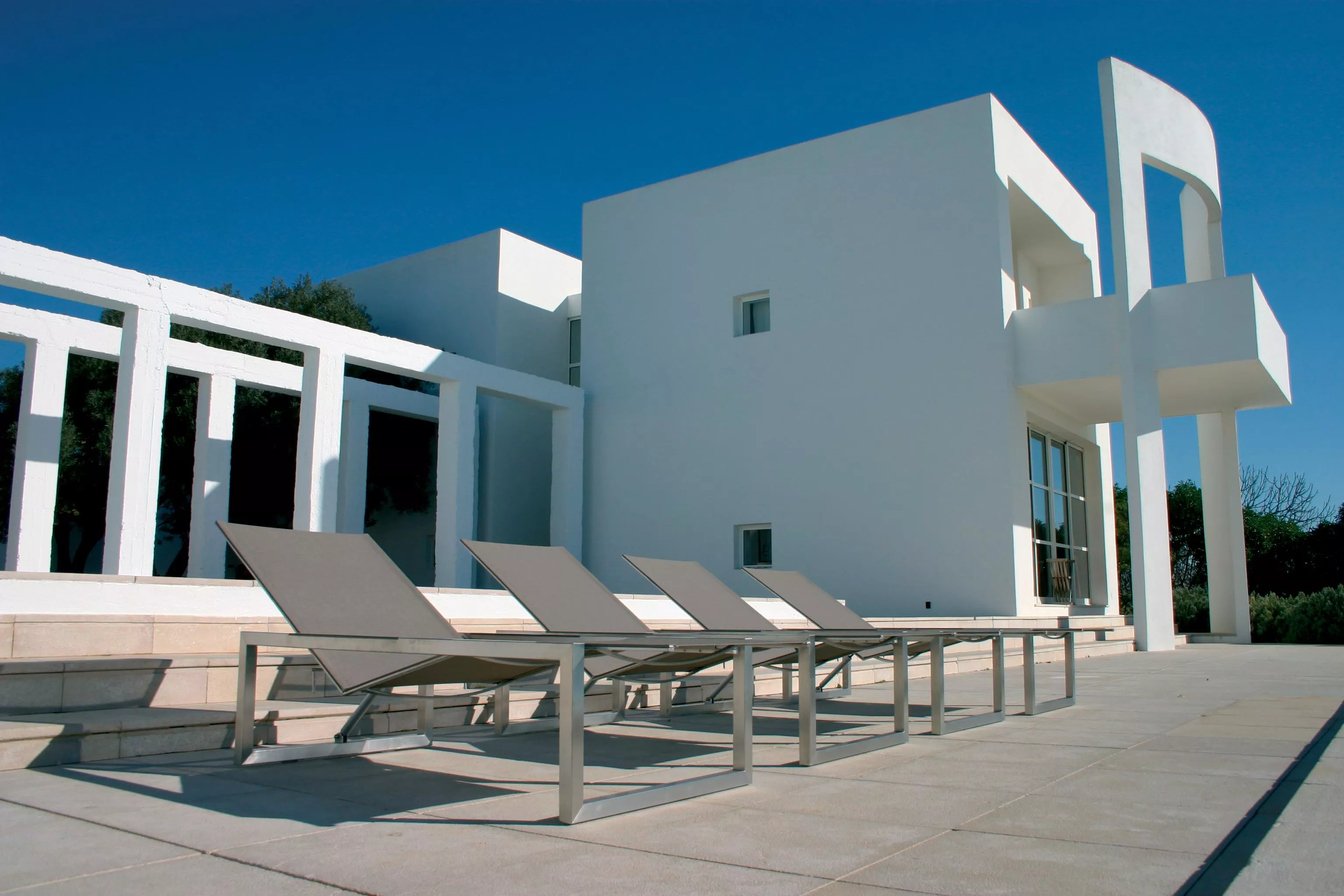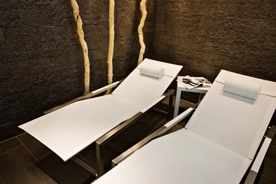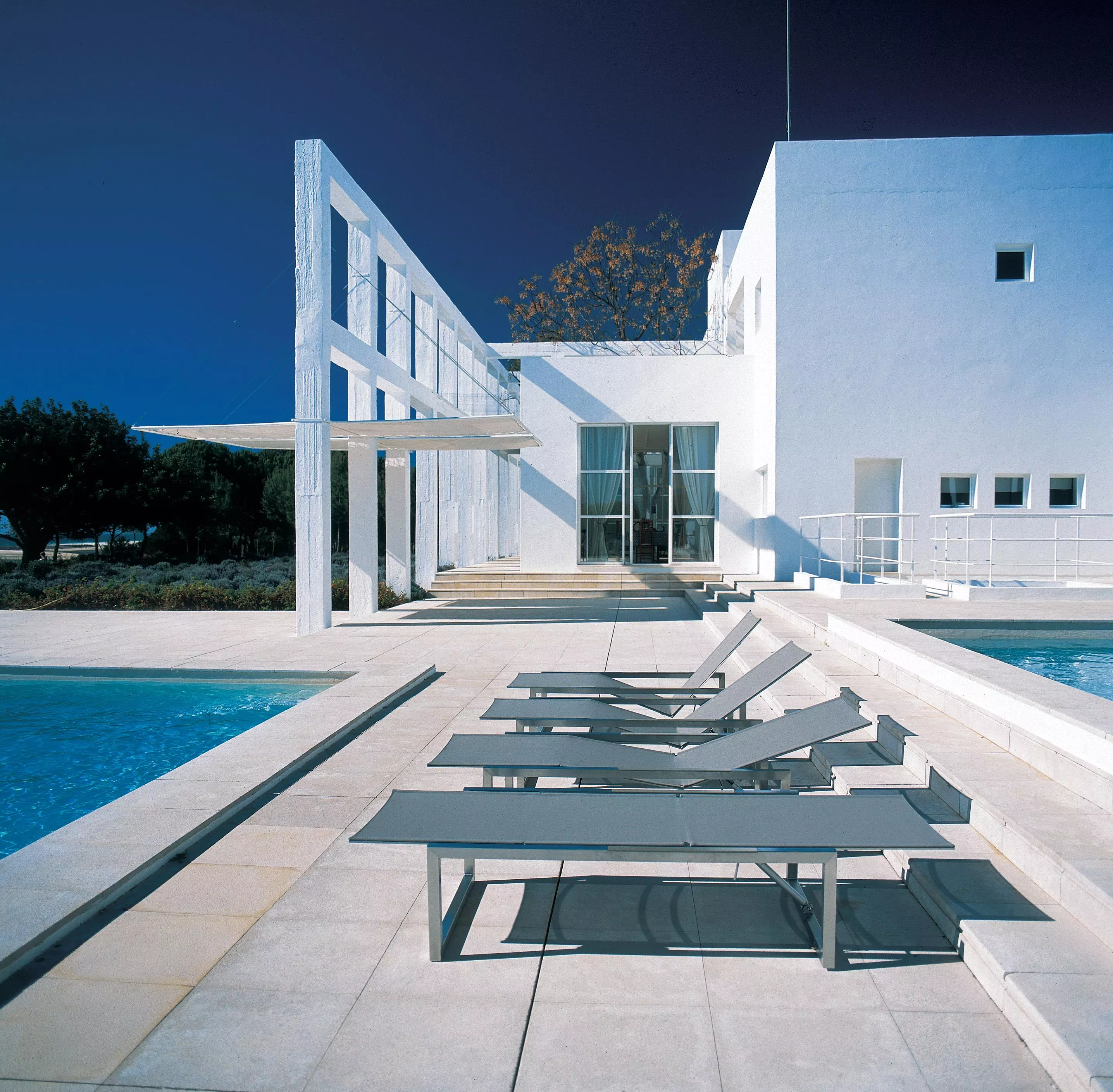 Die Sonnenliege Ninix mit Batyline-Bespannung, erhältlich in verschiedenen Farben. Die Sonnenliege ist kann wahlweise mit elektropoliertem Gestell bestellt werden und eignet sich dadurch hervorragend für den Einsatz im maritimen Bereich.