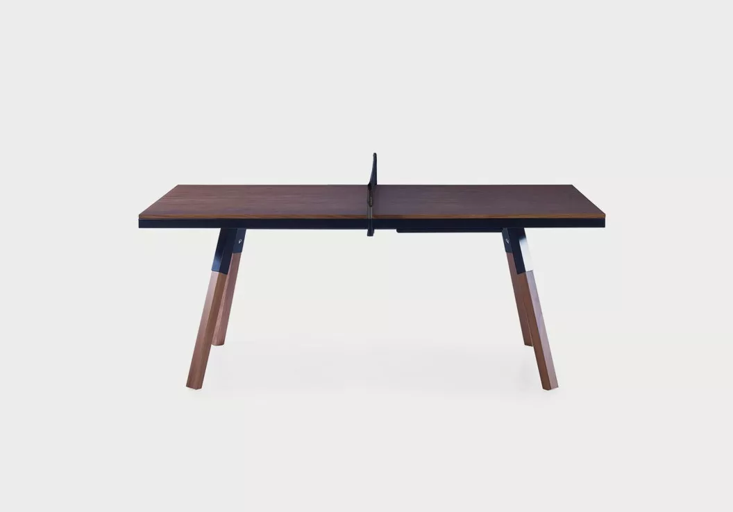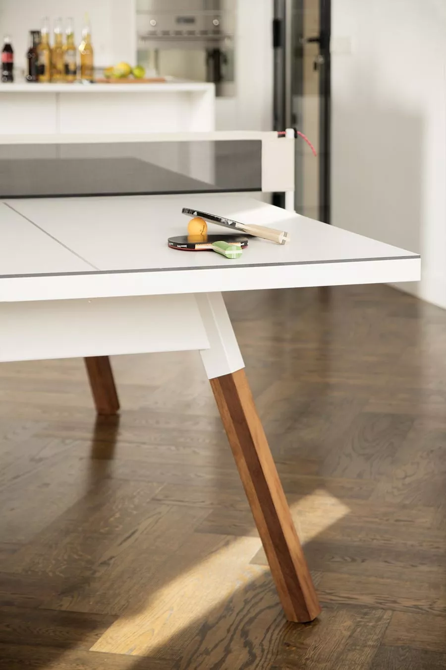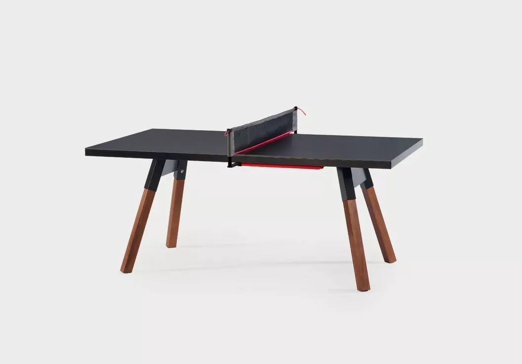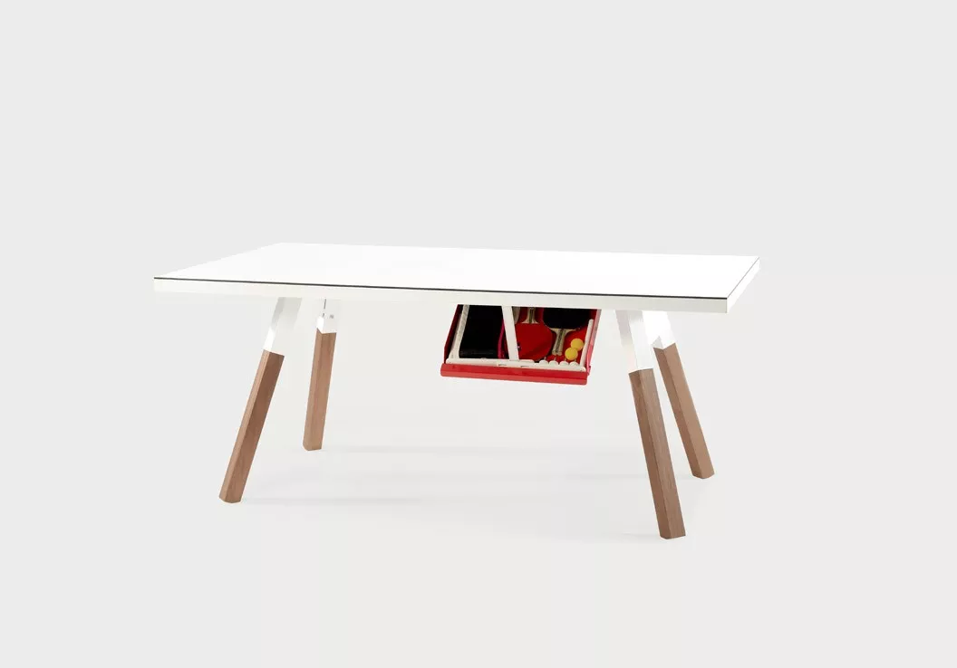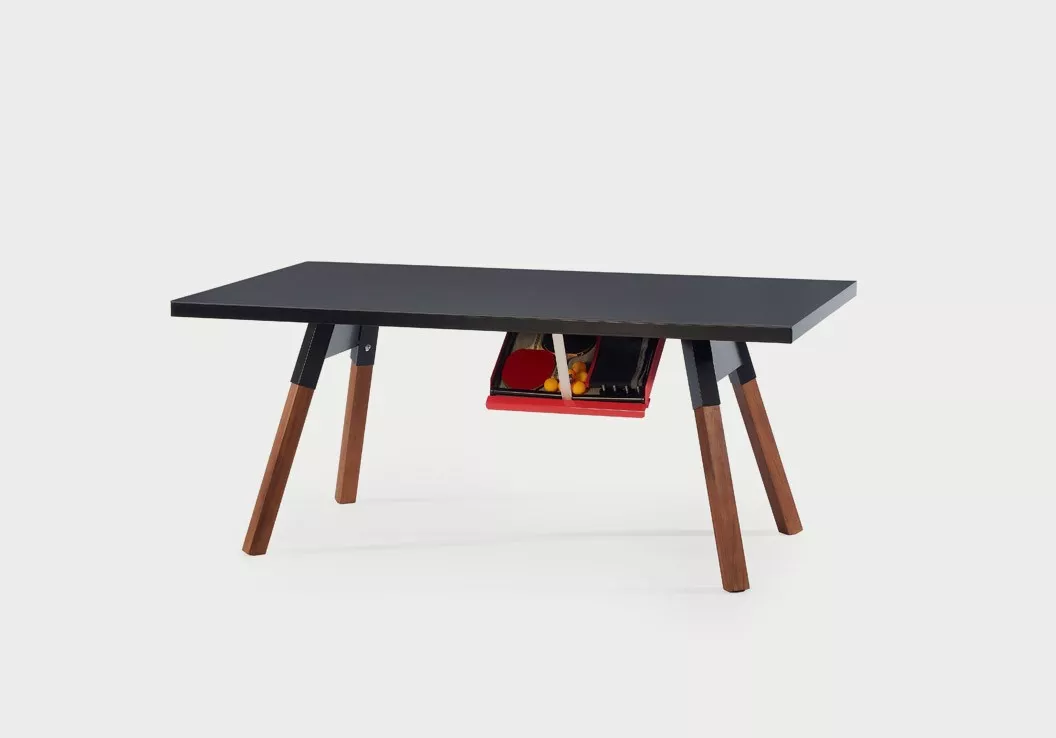 RS Barcelona – mehr als ein Esstisch. Es ist ein Esstisch. Aber es ist auch ein kleiner Tischtennistisch mit einer Oberfläche, einem Design und einer Struktur, die ihn voll spielbar machen. Die ganze Sportlichkeit, die er aus dem Netz, den Schlägern und den Bällen bezieht, kann in der Seitenschublade verstaut und vollständig versteckt werden. Er ist aus hochwertigen Materialien gefertigt und für den Innen- und Außenbereich geeignet. Der Tischtennistisch mit schwarzer Lackierung sollte im Außenbereich abgedeckt und mit einer Schutzhülle verwendet werden, um Verfärbungen durch die Sonne zu vermeiden. Die Walnusslackierung ist nur für den Innenbereich geeignet.
