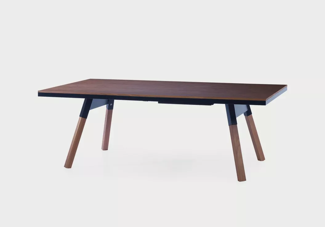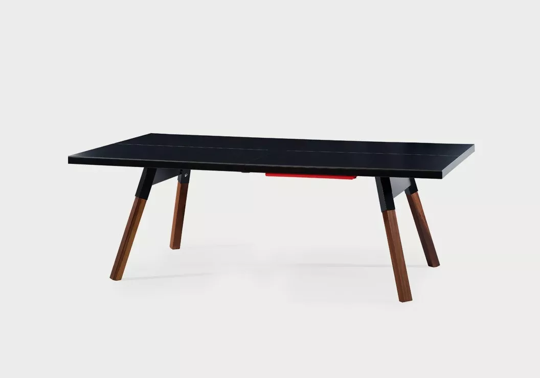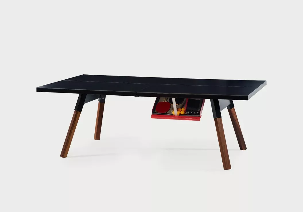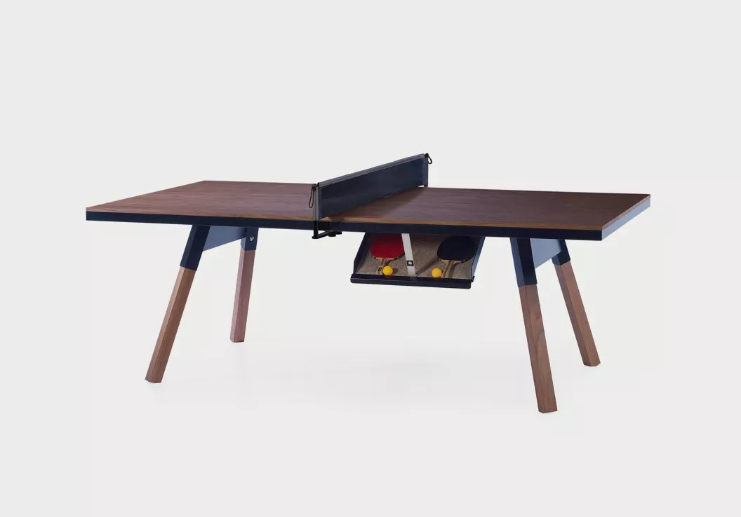 RS Barcelona – mehr als ein Esstisch. Es ist ein Esstisch. Aber es ist auch ein kleiner Tischtennistisch mit einer Oberfläche, einem Design und einer Struktur, die ihn voll spielbar machen. Die ganze Sportlichkeit, die er aus dem Netz, den Schlägern und den Bällen bezieht, kann in der Seitenschublade verstaut und vollständig versteckt werden. Die Walnusslackierung ist nur für den Innenbereich geeignet.