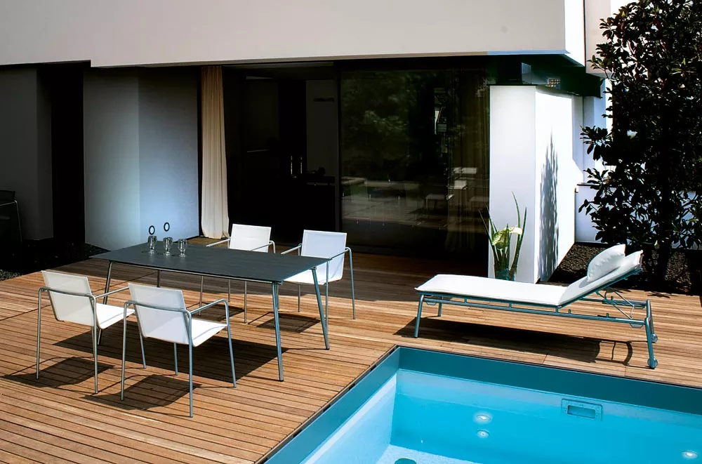 Der stapelbare Sesel Taku mit seiner mehrfach prämierten klaren Linienführung wird mit dauerelastischen Schnüren oder strapazierfähigem Gewebe angeboten. Sein robuster Rahmen besteht aus elegant geschliffenem Edelstahl. Beide Varianten überzeugen durch hervorragenden Sitzkomfort. Perfekt dazu passen die Taku Tische sowie die stapelbare Taku Liege.
