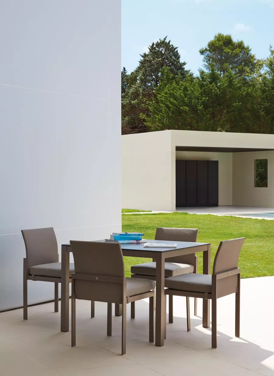 Komfy Tischplatte 74,5 × 74,5 cm von Sifas Unendlich modular ist dieses niedrige Loungeset dezent und elegant und ermöglicht die Gestaltung individuell angepasster Loungebereiche. Mit nur 5 strukturellen Teilen (2 Sitzgrößen, Armlehnen und austauschbare Rückenlehnen, Beine aus Aluminium oder Edelstahl) kann Komfy sowohl als gerade Sitzbank oder klassischer Sessel präsentiert werden, ebenso wie als Lounge-Eckgarnitur, die je nach Wunsch und Bedarf um eine Bank, eine Chaiselongue oder eine Méridienne ergänzt werden kann. Lackiertes Aluminium Edelstahlverchromte Aluminiumstrukturen, lackiert und gebrannt bei (392°F). Die Epoxidpulverbeschichtung wird gleichmäßig (80-Mikron-Schicht) mittels elektrostatischer Sprühtechnik aufgetragen. In diesem Verfahren werden die Mikroperlen des Pulvers von der gesamten Metalloberfläche angezogen und haften perfekt am Aluminium. Im Ofen schmelzen und härten sie durch die Hitze aus und bilden eine gleichmäßige und extrem widerstandsfähige Lackschicht. Die lackierte Oberfläche von Sifas® ist entweder glatt und glänzend oder strukturiert mit Granitoptik. Sie ist garantiert witterungsbeständig. Der Prozess wird während der Produktion geprüft, um die Haftung des Lacks auf dem Metall mittels Gitterschnittprüfung zu verifizieren – einer Methode, die in der Automobilindustrie verwendet wird (ISO-Norm 2409). Textylene® Textylene®, ein gewebtes PVC-beschichtetes Polyestergewebe, ist in zahlreichen Märkten branchenführend. Als herausragender Stoff für Freizeitmöbel ist Textylene® weltweit auf Stühlen, Kissen und Sonnenschirmen zu finden. Unübertroffen in Stärke und Schönheit besteht Textylene® aus PVC-beschichtetem, gewebtem Polyesterfaden, der nicht ausleiert. Textylene® ist flammhemmend, heißsiegelfähig, schimmelresistent und stabil bei sowohl hohen als auch niedrigen Temperaturen. Textylene® ist ein hervorragender Objektstoff hinsichtlich Langlebigkeit, speziell entwickelt aus Garnen, die jahrelanger Abnutzung im Außenbereich standhalten. Geringer Pflegeaufwand und Farben, die auch nach Jahren intensiver Außennutzung frisch und lebendig bleiben – selbst unter extremen Wetterbedingungen. Technische Daten und FarbdatenStruktur Struktur aus 304-Edelstahlrohren, zu 90 % recycelbar, elektropolierte Oberfläche, die ferromagnetische Partikel entfernt und eine erhöhte Beständigkeit gegen atmosphärische Korrosion, chemische Einflüsse und Salznebel gewährleistet. Verschleißfeste Gleiter aus Polyamid, verstärkt mit Glasfaser Komfort Kissen aus Outdoor-Acryl Tischplatte Glasplatte, auf der Unterseite bei 900° C (1652°F) emailliert, chemisch mattiert auf Oberseite und Kanten (keine Fingerabdrücke) Modularität Modulares Wohnzimmermöbel-Set. Die Module können nach Belieben miteinander verbunden werden, um durchgehende Sitzmöbel zu bilden. Öko-Design Komfy entstand aus einem nachhaltigen Ansatz, d. h. der Wahl langlebiger, CO₂-armer, recycelbarer Materialien mit gutem Gewichts-/Leistungsverhältnis, um die Umweltbelastung der Produkte und Dienstleistungen über ihren gesamten Lebenszyklus hinweg zu reduzieren. Maße: (B × T × H) 74,5 × 74,5 × 0,8 cm