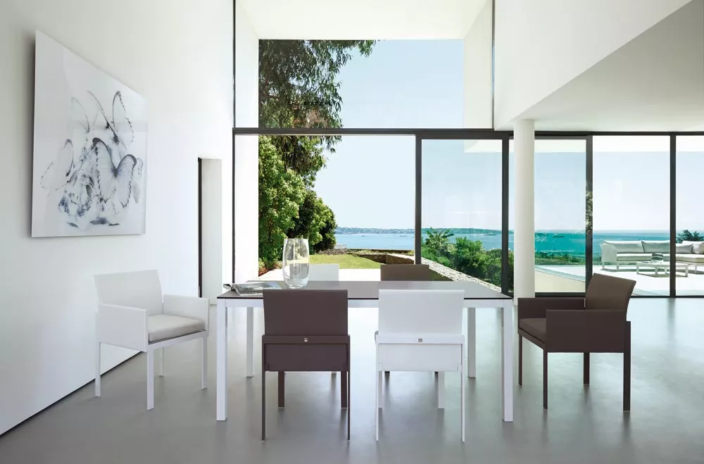 2-er Set Komfy Essstuhl von Sifas Unendlich modular ist dieses niedrige Loungeset dezent und elegant und ermöglicht Ihnen die Gestaltung individuell angepasster Loungebereiche. Mit nur 5 strukturellen Teilen (2 Sitzgrößen, Armlehnen und austauschbare Rückenlehnen, mit Aluminium- oder Edelstahlbeinen) kann Komfy sowohl als gerade Sitzbank oder klassischer Sessel präsentiert werden, ebenso als Lounge-Eckgarnitur, der je nach Wunsch und Bedarf eine Bank, eine Chaiselongue oder eine Méridienne hinzugefügt werden kann. Lackiertes Aluminium Edelstahlverchromte Aluminiumstrukturen, lackiert und bei (392°F / 200°C) eingebrannt. Die Epoxid-Pulverbeschichtung wird gleichmäßig (80-Mikron-Schicht) mittels elektrostatischer Sprühung aufgetragen. In diesem Prozess werden die Mikro-Pulverkügelchen von der gesamten Metalloberfläche angezogen und haften perfekt am Aluminium. Im Ofen schmelzen sie und härten durch die Hitze aus, wodurch eine gleichmäßige und extrem widerstandsfähige Lackschicht entsteht. Die Lackierung von Sifas® ist entweder glatt und glänzend oder hat eine strukturierte Granitoptik. Sie ist wetterfest garantiert. Der Prozess wird während der Produktion getestet, um die Haftung des Lacks auf dem Metall mittels Gitterschnittprüfung zu überprüfen – einer Methode aus der Automobilindustrie (ISO-Norm 2409). Textylene® Textylene® ist ein gewebtes, PVC-beschichtetes Polyestergewebe und führend in zahlreichen Marktsegmenten. Am bekanntesten ist es als hochwertiger Stoff für Freizeitmöbel; weltweit findet man Textylene® auf Stühlen, Kissen und Sonnenschirmen. Unübertroffen in Stärke und Ästhetik besteht Textylene® aus PVC-beschichtetem, gewebtem Polyester, das nicht ausleiert. Textylene® ist flammhemmend, hitzeverschweißbar, schimmelresistent und sowohl bei hohen als auch niedrigen Temperaturen stabil. Textylene® ist ein herausragender Objektstoff in Bezug auf Haltbarkeit, speziell entwickelt aus Garnen, die viele Jahre intensiver Outdoor-Nutzung standhalten. Minimaler Pflegeaufwand und Farben, die auch nach jahrelanger kontinuierlicher Außenbewitterung kräftig und lebendig bleiben – selbst unter härtesten Wetterbedingungen. Technische und FarbdatenStruktur Struktur aus Edelstahlrohren 304, zu 90 % recycelbar, mit elektrolytisch polierter Oberfläche, die oberflächliche Eisenpartikel entfernt und die Beständigkeit gegen atmosphärische Korrosion, chemische Einwirkungen und Salzsprühnebel erhöht. Verschleißfeste Gleiter aus Polyamid, verstärkt mit Fiberglas Komfort Kissen aus Outdoor-Acryl Tischplatte Glasplatte unten bei 900°C (1652°F) emailliert, oben und an den Kanten chemisch mattiert (keine Fingerabdrücke) Modularität Modulares Wohnzimmermöbelset. Die Module können nach Belieben miteinander verbunden werden, um einteilige Sitzmöbel zu bilden. Öko-Design Komfy wurde von einem nachhaltigen Ansatz inspiriert – durch die Wahl langlebiger Materialien mit geringem CO₂-Fußabdruck, die zudem recycelbar sind und ein gutes Verhältnis von Gewicht zu Leistung bieten, um die Umweltbelastung der Produkte und Dienstleistungen während ihres gesamten Lebenszyklus zu reduzieren. Maße: (B × T × H) 49 × 57 × 85 cm