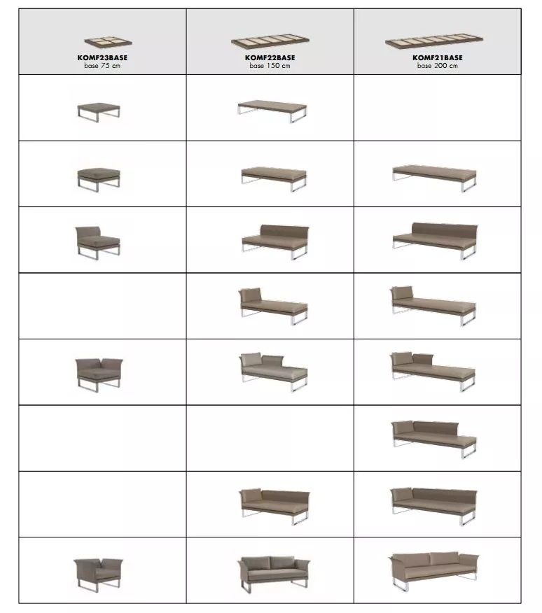 Komfy Basismodul 75, 150 oder 200 cm von Sifas Unendlich modular ist dieses niedrige Loungeset dezent und elegant und ermöglicht Ihnen die Gestaltung individuell angepasster Loungebereiche. Mit nur 5 strukturellen Teilen (2 Sitzgrößen, Armlehnen und austauschbare Rückenlehnen, mit Aluminium- oder Edelstahlbeinen) kann Komfy sowohl als gerade Sitzbank oder klassischer Sessel präsentiert werden, ebenso als Lounge-Eckgarnitur, der je nach Wunsch und Bedarf eine Bank, eine Chaiselongue oder eine Méridienne hinzugefügt werden kann. Lackiertes Aluminium Edelstahlverchromte Aluminiumstrukturen, lackiert und bei (392°F / 200°C) eingebrannt. Die Epoxid-Pulverbeschichtung wird gleichmäßig (80-Mikron-Schicht) mittels elektrostatischer Sprühung aufgetragen. In diesem Prozess werden die Mikro-Pulverkügelchen von der gesamten Metalloberfläche angezogen und haften perfekt am Aluminium. Im Ofen schmelzen sie und härten durch die Hitze aus, wodurch eine gleichmäßige und extrem widerstandsfähige Lackschicht entsteht. Die Lackierung von Sifas® ist entweder glatt und glänzend oder hat eine strukturierte Granitoptik. Sie ist wetterfest garantiert. Der Prozess wird während der Produktion getestet, um die Haftung des Lacks auf dem Metall mittels Gitterschnittprüfung zu überprüfen – einer Methode aus der Automobilindustrie (ISO-Norm 2409). Textylene® Textylene® ist ein gewebtes, PVC-beschichtetes Polyestergewebe und führend in zahlreichen Marktsegmenten. Am bekanntesten ist es als hochwertiger Stoff für Freizeitmöbel; weltweit findet man Textylene® auf Stühlen, Kissen und Sonnenschirmen. Unübertroffen in Stärke und Ästhetik besteht Textylene® aus PVC-beschichtetem, gewebtem Polyester, das nicht ausleiert. Textylene® ist flammhemmend, hitzeverschweißbar, schimmelresistent und sowohl bei hohen als auch niedrigen Temperaturen stabil. Textylene® ist ein herausragender Objektstoff in Bezug auf Haltbarkeit, speziell entwickelt aus Garnen, die viele Jahre intensiver Outdoor-Nutzung standhalten. Minimaler Pflegeaufwand und Farben, die auch nach jahrelanger kontinuierlicher Außenbewitterung kräftig und lebendig bleiben – selbst unter härtesten Wetterbedingungen. Technische und FarbdatenStruktur Struktur aus Edelstahlrohren 304, zu 90 % recycelbar, mit elektrolytisch polierter Oberfläche, die oberflächliche Eisenpartikel entfernt und die Beständigkeit gegen atmosphärische Korrosion, chemische Einwirkungen und Salzsprühnebel erhöht. Verschleißfeste Gleiter aus Polyamid, verstärkt mit Fiberglas Komfort Kissen aus Outdoor-Acryl Tischplatte Glasplatte unten bei 900°C (1652°F) emailliert, oben und an den Kanten chemisch mattiert (keine Fingerabdrücke) Modularität Modulares Wohnzimmermöbelset. Die Module können nach Belieben miteinander verbunden werden, um einteilige Sitzmöbel zu bilden. Öko-Design Komfy wurde von einem nachhaltigen Ansatz inspiriert – durch die Wahl langlebiger Materialien mit geringem CO₂-Fußabdruck, die zudem recycelbar sind und ein gutes Verhältnis von Gewicht zu Leistung bieten, um die Umweltbelastung der Produkte und Dienstleistungen während ihres gesamten Lebenszyklus zu reduzieren. Maße: (B × T × H) 75 × 75 × 6,5 cm 150 × 75 × 6,5 cm 200 × 75 × 6,5 cm