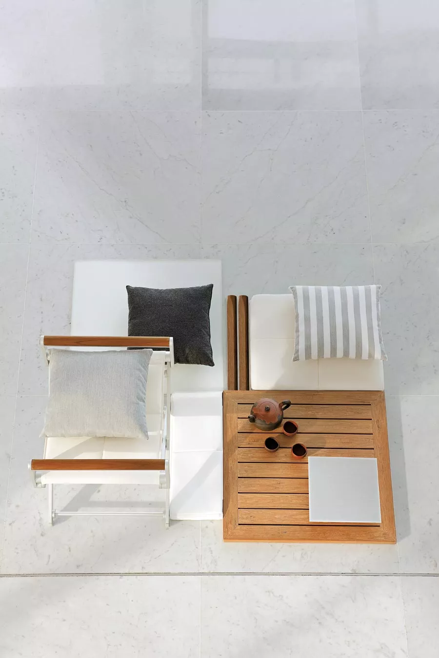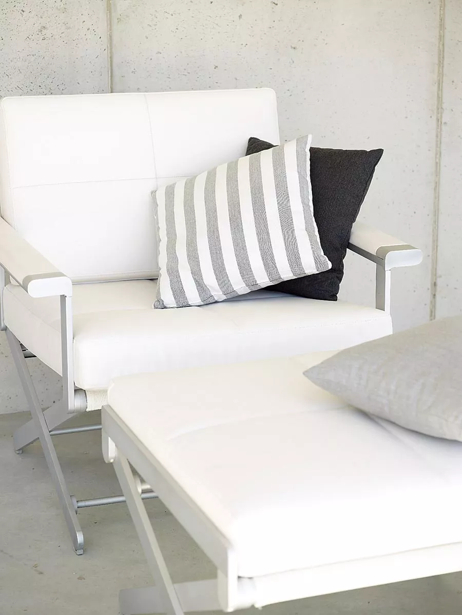 - Armlehnen aus geöltem Teak oder lederbezogen (werden mit Lederkissen geliefert).
