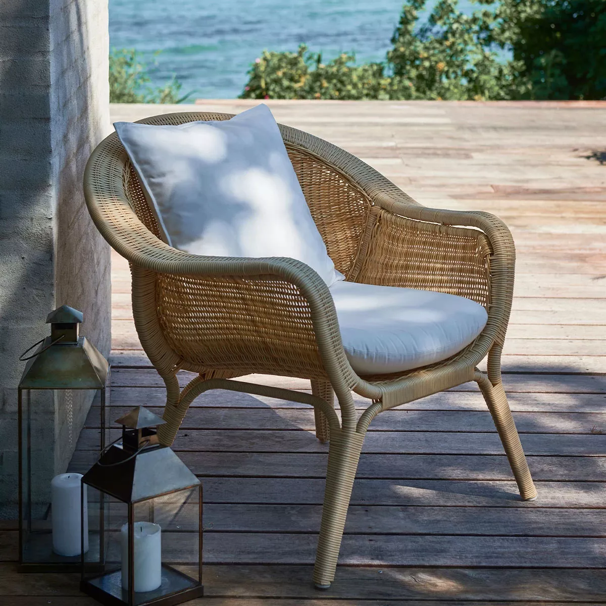 Georgia Garden Marie Armlehnstuhl mit einem Aluminiumgestell und handgeflochtenen Polyrattan Gehören Sie zu den Menschen, die ab uns zu eine Tasse Tee in Ihrem Garten genießen? Dann verdienen Sie ein richtiges Sitzen. Der Georgia Garten Marie Armlehnstuhl von Sika Design passt wunderbar in die gemütliche Umgebung und wenn es nicht genügend Platz gibt können Sie den Maria Stuhl ohne Armlehnen wählen. Das Polyrattan Geflecht der Georgia Garden Kollektion besteht aus einem Kunststoff, dass absolut resistent gegen Witterungseinflüsse ist und im Laufe der Zeit farbbestängig bleibt. Es ist handgflochten und hat eine Oberfläche, die sich ganz gut anfühlt und sehr natürlich aussieht. Polyrattan Geflecht in der Farbe Antik Braun oder Vintage white, handgeflochten die Herstellung dieser hochwertigen Möbel erfolgt in erstklassiger Qualität UV-, witterungs- und farbbeständig leicht zu reinigen Maße: (B × T × H × Sitzhöhe) 59 × 86 × 63 × 48 cm