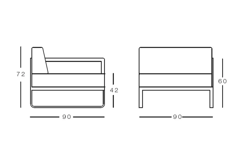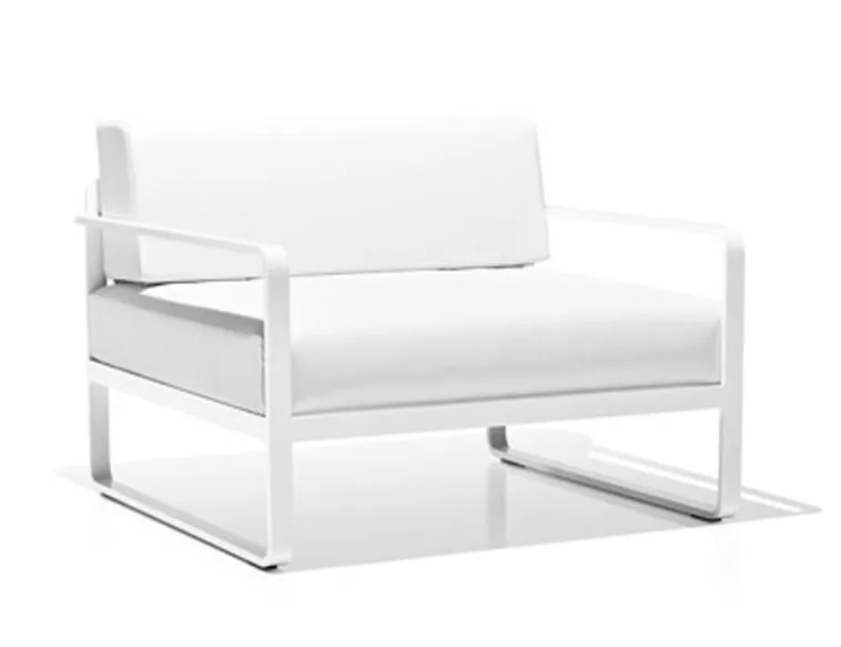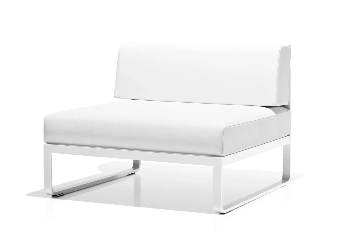 Modular system of sofas manufactured with an extruded aluminium structure and final finish made with polyester powder coating. Acrylic fabric: 100% solution dyed acrylic, UV resistance (class. 7/8) with stain and water repellent finish. Washable at 30ºC. Open air drying. Vinytex fabric: synthetic fabric made of plastic coated polyester. Incorporate a waterproof layer. UV resistance (class. 7/8). It is recommended to clean it with neutral soap diluted in large quantity of water.