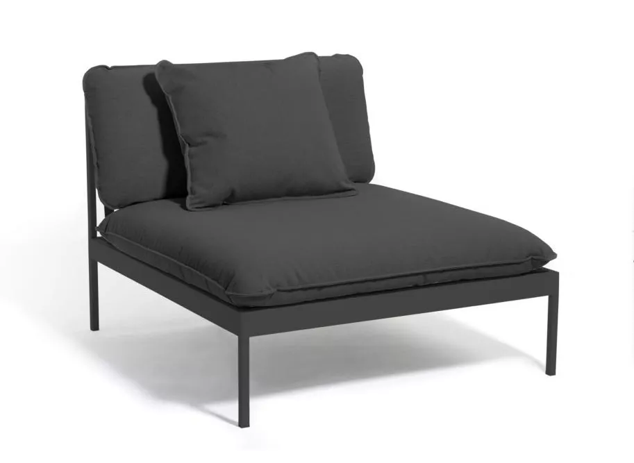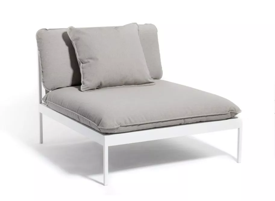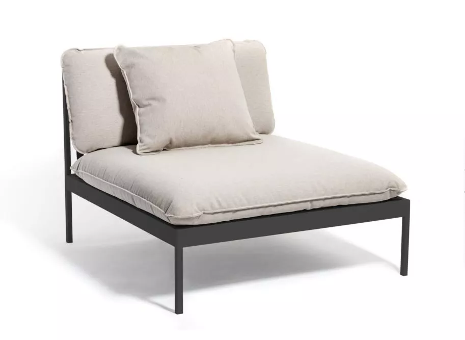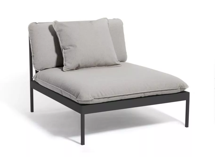 Bönan. Ein cleveres modulares Sofasystem, dass für den flexiblen ganzjährigen Einsatz im Freien konzipiert ist. Sehr vielseitig, sehr langlebig. Das Gestell ist aus Aluminium beschichtet und die Kissen sind aus Sunbrella® Outdoorstoffen (mit Quickdry-Schaum gefüllt) hergestellt.