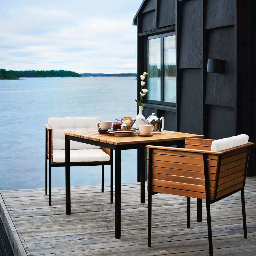 Skargaarden Häringe • Gartentisch 85 cmDas Schloß Häringe schmiegt sich an die Küstenfelsen von Landfjärden Bay. Es steht dort seit 272 Jahren, bis Torsten Kreuger es im Jahr 1929 kaufte. Torsten war ein Mann mit wenig Verständnis für denkmalgeschützte Gebäude aber mit großem Interesse für neue Moden. Er installierte schnell einen Kühlschrank in der Küche, eine Kegelbahn in einem der Flügel und Schwedens ersten Swimming Pool in einem Schlossgarten. Im Laufe der Zeit wurde das Schloß zu einem Jet-Set-Treffpunkt, wo man sowohl Josephine Baker als auch Greta Garbo antreffen konnte. Dekadent? - Vielleicht ein bisschen. Modisch? - Bis zu einem gewissen Ausmaß. Würde man ein Möbelstück nach den gleichen Prinzipien designen, könnten sie sich auf feste Traditionen stützen mit deutlichen, ausgewogenen Grundsätzen. Zum klassischen, originellen Design fügt sich eine verschwenderische Verspieltheit und ein Hauch von Luxus. Das war, was wir taten, als wir die Dining Möbel Serie namens Häringe entwickelten. Greta Garbo wäre das perfekte Zubehör gewesen. Aber es funktioniert mit jeder geheimnisvollen Schönheit mit einer dunklen Sonnenbrille. Wenn Sie das ursprüngliche Aussehen der Häringe Kollektion im Outdoor Einsatz behalten möchten, können die Möbelstücke jährlich geölt werden. Sonst wird langsam eine schöne graue Patinierung entstehen, die Häringe noch einzigartiger macht. Produkteigenschaften Gestell aus Edelstahl oder Edelstahl beschichtet Tischplatte: Teakholz wetterfeste Materialien leicht zu reinigen Maße: (B × T × H) 85 × 85 × 71,5 cm Gewicht: 17 Kg
