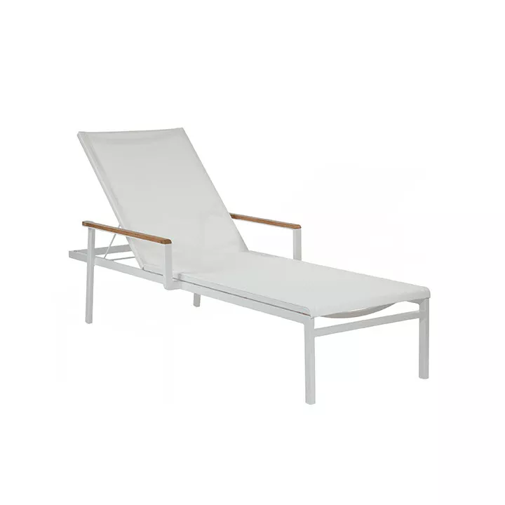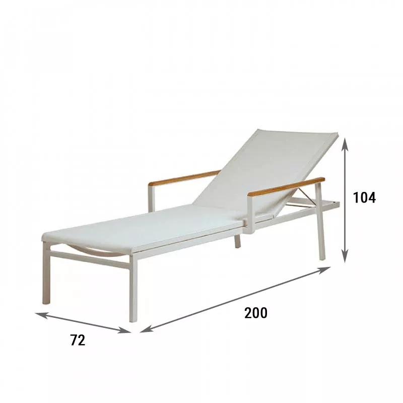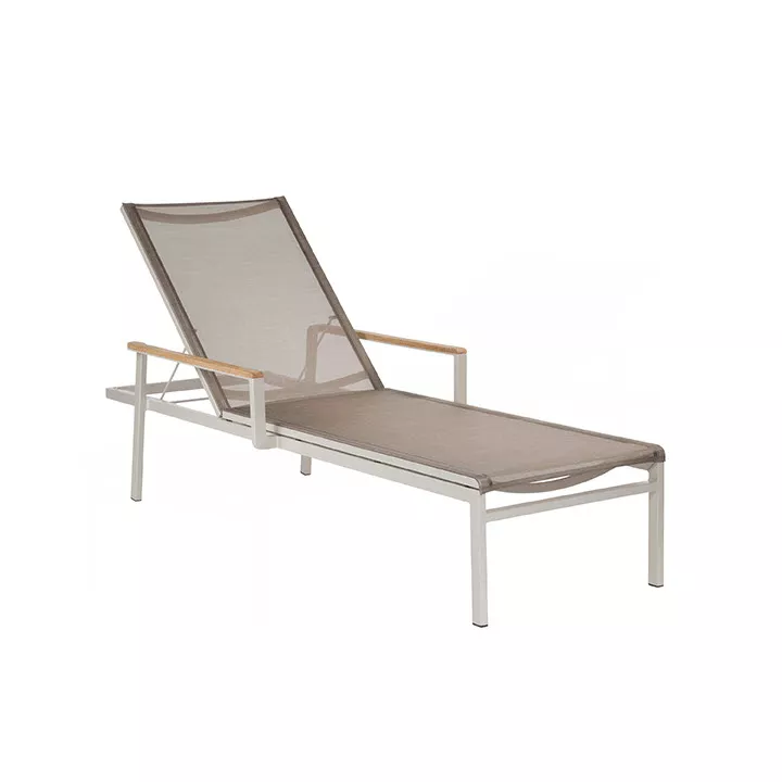 Sonnenliege Aura aus Synthetikgewebe und einem Gestell aus Aluminium. Mit der in 5 Positionen - auch vollkommen flach - verstellbaren Rückenlehne ist dies ein äußerst bequemer Liegestuhl.