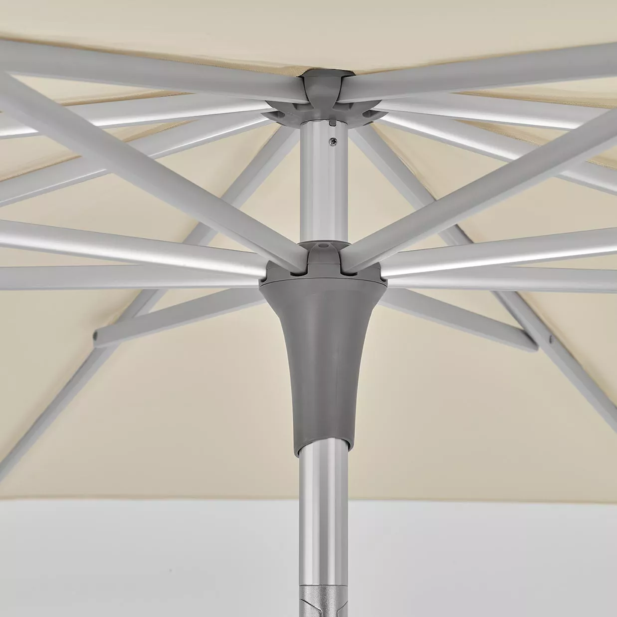 Das Gestell ist aus Aluminium natureloxiert mit profiliertem Mast und stufenloser Höhenverstellung mit Kippgelenk. Schirmbezug ist auswechselbar und dank den flexiblen Strebenenden selbstspannend.