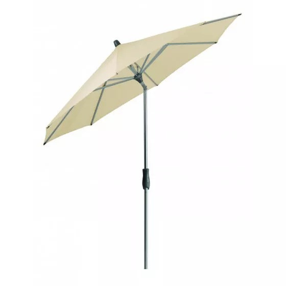 Material und Technik: Das Gestell ist aus Aluminium mit profiliertem Mast, Kurbelantrieb und Drehmechanismus für stufenlose Schrägstellung. Schirmbezug ist auswechselbar und selbstspannend, dank den flexiblen Strebenenden.
