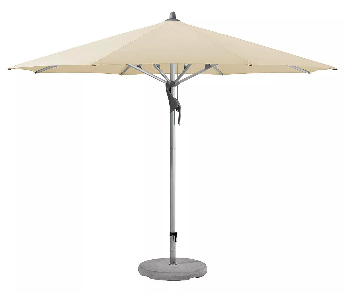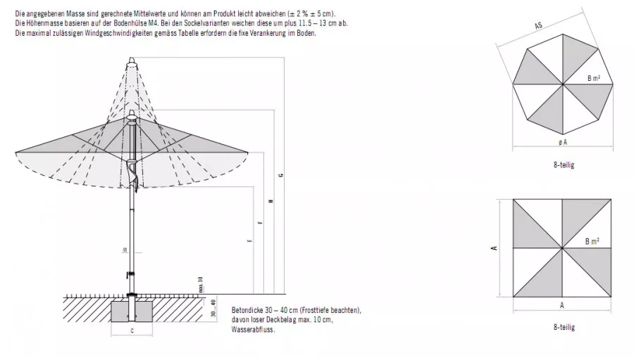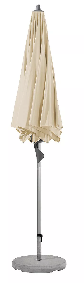 Material und Technik: Das Gestell ist aus Aluminium mit zweiteiligem profiliertem Mast. Schieber und Krone sind aus robustem Aluminium-Druckguss. Der Schirmbezug ist auswechselbar und selbstspannend, dank den flexiblen Strebenenden.