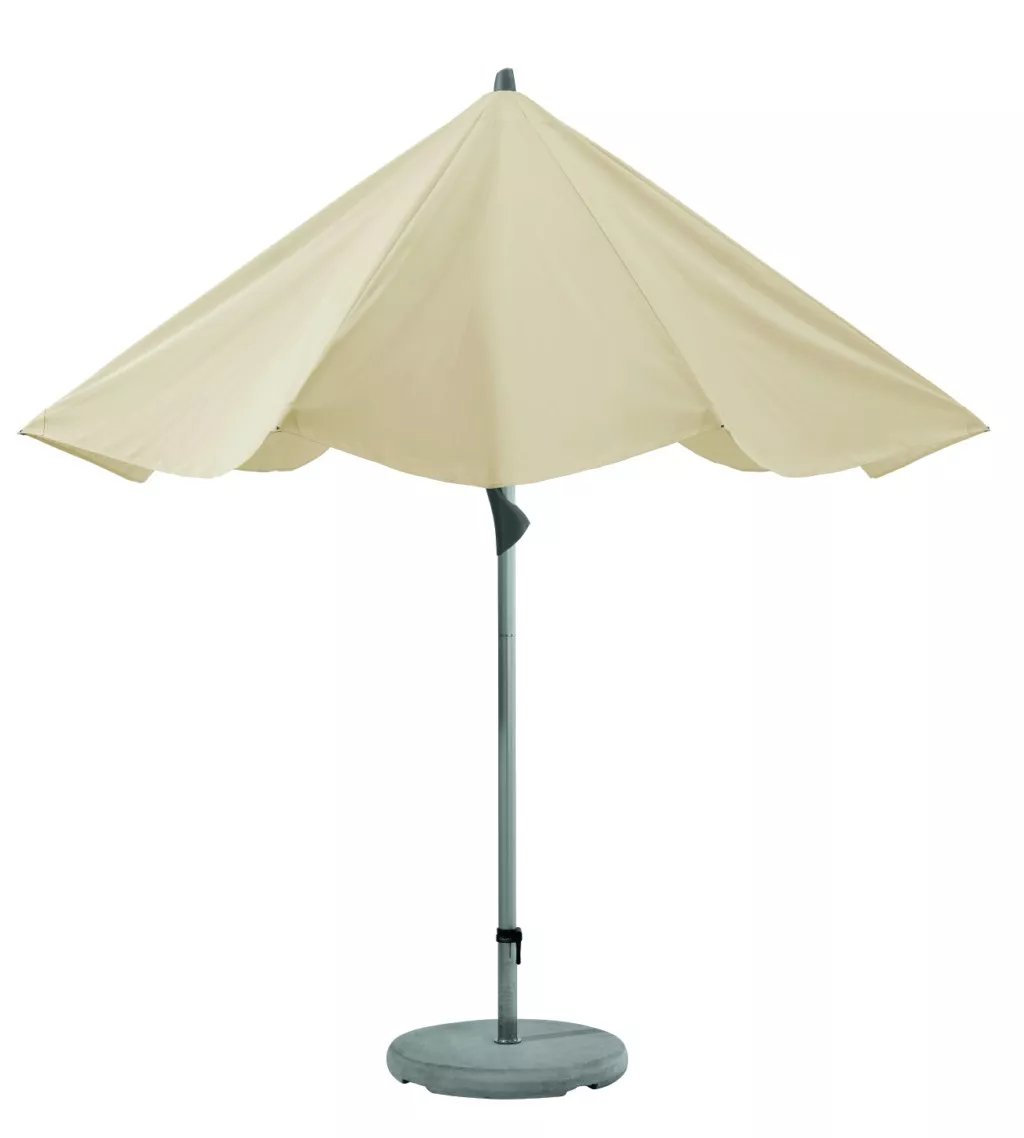 Material und Technik: Das Gestell ist aus Aluminium mit zweiteiligem profiliertem Mast. Schieber und Krone sind aus robustem Aluminium-Druckguss. Der Schirmbezug ist auswechselbar und selbstspannend, dank den flexiblen Strebenenden.