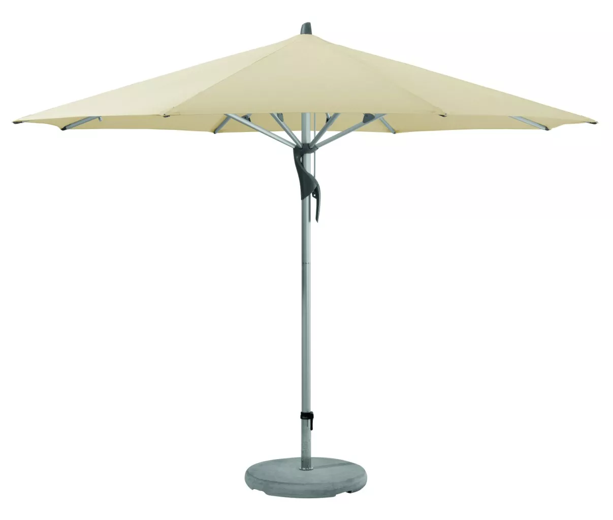 Material und Technik: Das Gestell ist aus Aluminium mit zweiteiligem profiliertem Mast. Schieber und Krone sind aus robustem Aluminium-Druckguss. Der Schirmbezug ist auswechselbar und selbstspannend, dank den flexiblen Strebenenden.