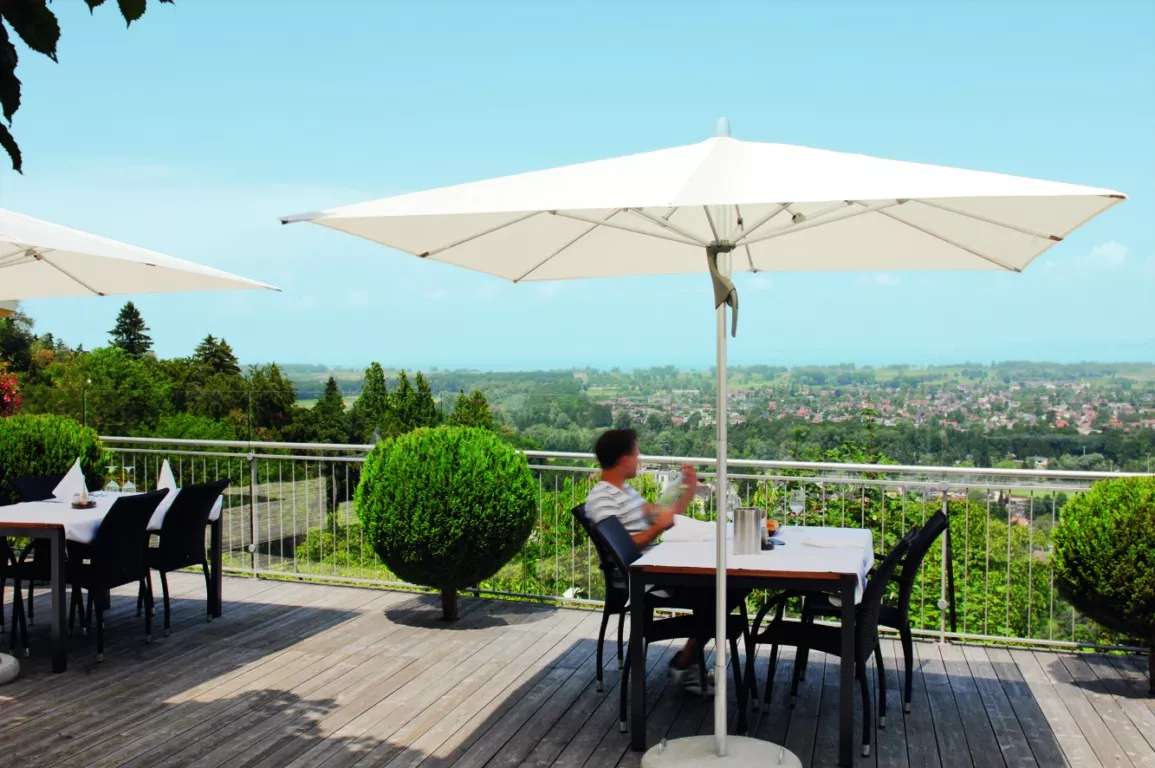 Fortino individual ist mehr als ein einfacher, zweckmässiger und grosser Sonnenschirm. Sein Sonnendach filtert schädliche UV-Strahlen nachhaltig und bietet Sonnenschutz nach
