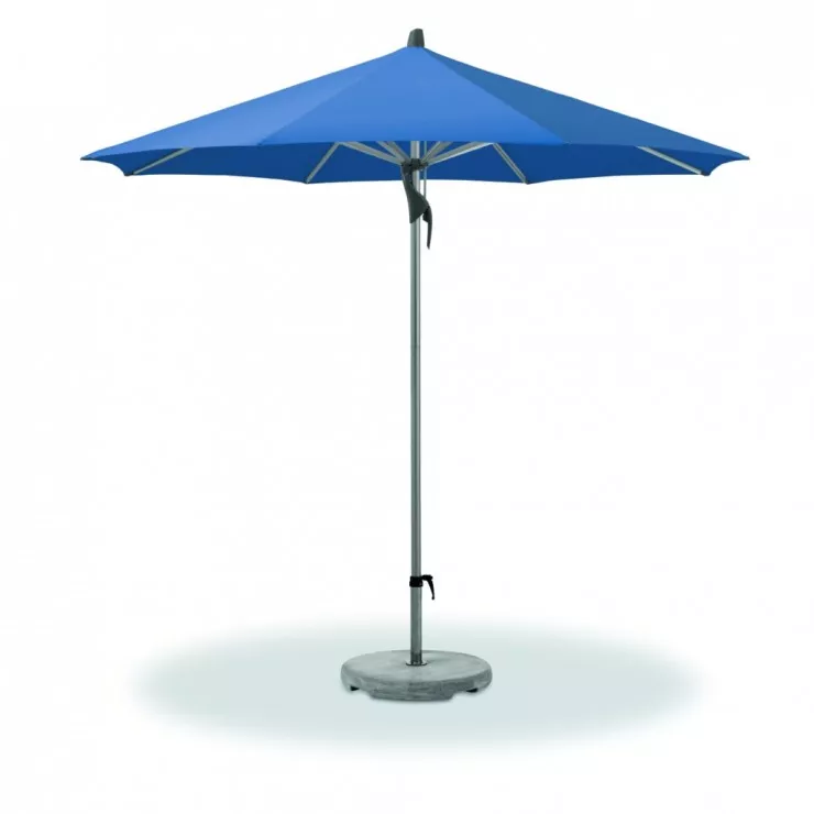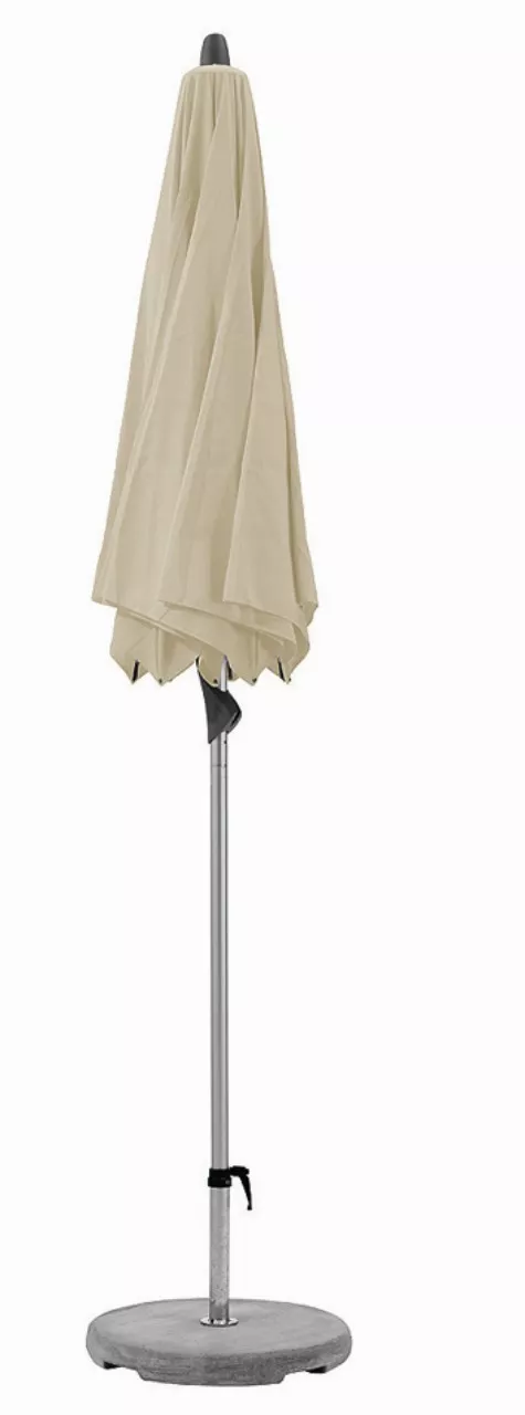 Material und Technik: Das Gestell ist aus Aluminium mit zweiteiligem profiliertem Mast. Schieber und Krone sind aus robustem Aluminium-Druckguss. Der Schirmbezug ist auswechselbar und selbstspannend, dank den flexiblen Strebenenden.