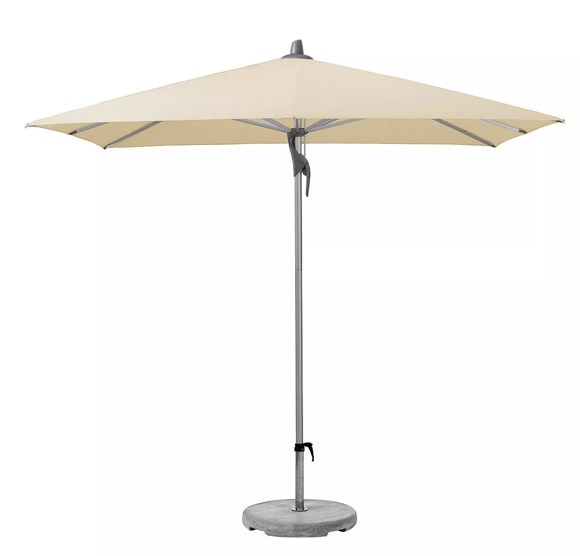 Material und Technik: Das Gestell ist aus Aluminium mit zweiteiligem profiliertem Mast. Schieber und Krone sind aus robustem Aluminium-Druckguss. Der Schirmbezug ist auswechselbar und selbstspannend, dank den flexiblen Strebenenden.