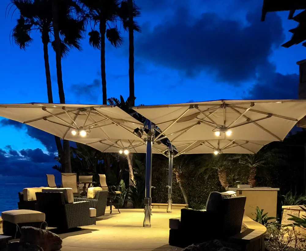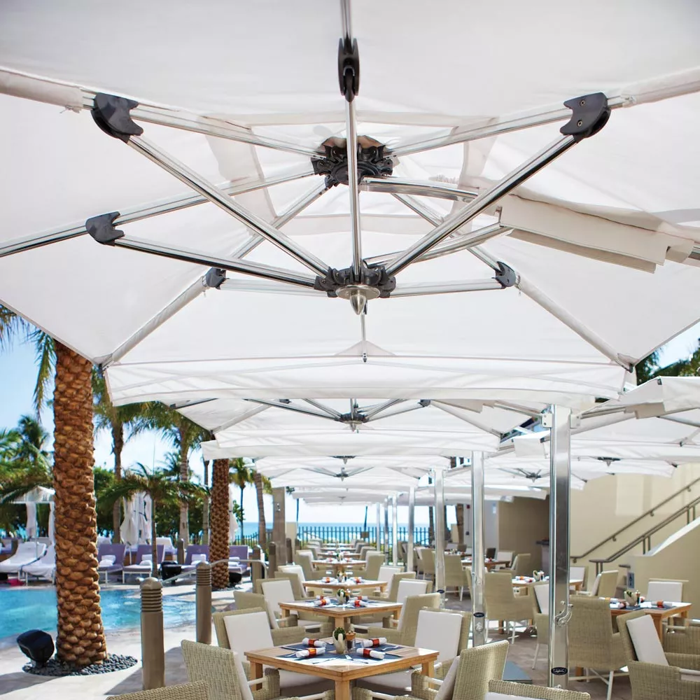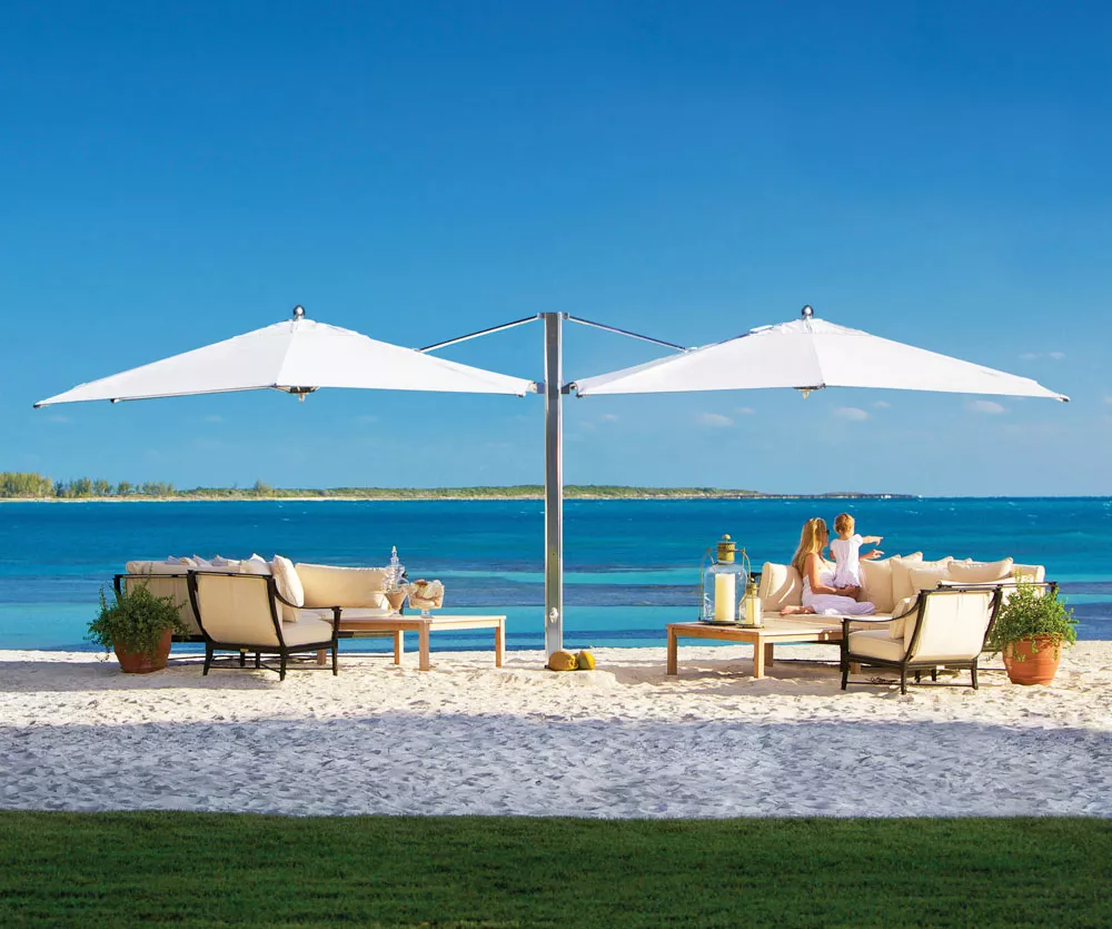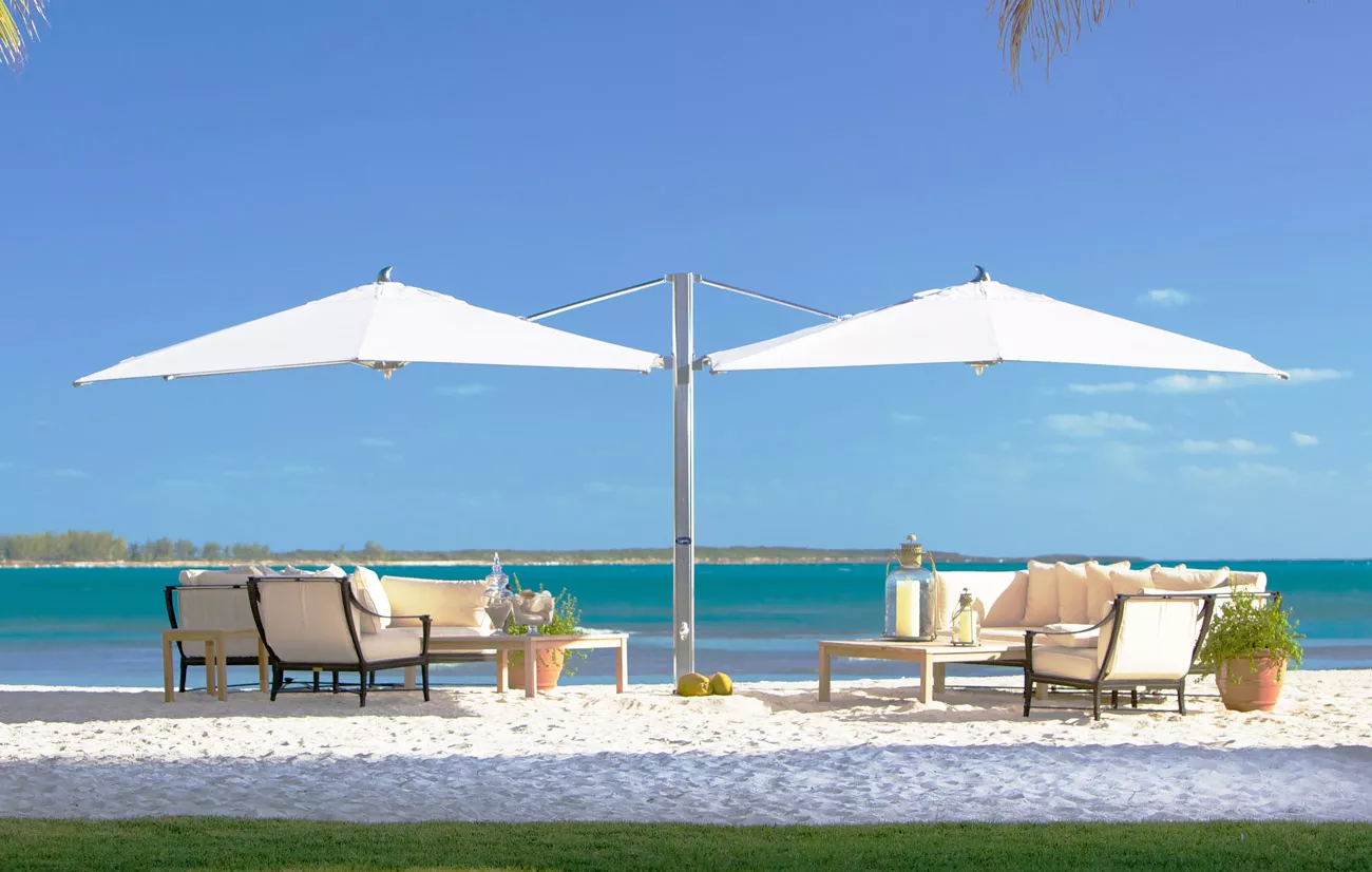 Im Ocean Master MAX Dual Cantilever Classic™ von TUUCI trifft Kunst auf Technik und verbindet beide auf harmonische Weise zu einer Schattenkomposition. Der exquisite Doppelschirm bietet großzügigen, luxuriösen Schatten, dank dem zwei eigene Outdoor-Wohnbereiche unter nur einem Sonnenschirm Platz finden – unterbrechungsfreier Schatten nach Maß. Dank des 4:1-Tandem-Einholkurbelsystems lässt sich der Dual Cantilever sehr einfach bedienen. Die einzelne Kurbel öffnet gleitend beide Schattenspender und sorgt so für freien Durchgang und unterbrechungsfreie Atmosphäre. Dank des extrem robusten Drehpunkts aus gefrästem Aluminium mit automatischem Teleskopmast kann die Bespannung mühelos über Tischen und Stühlen geschlossen werden.