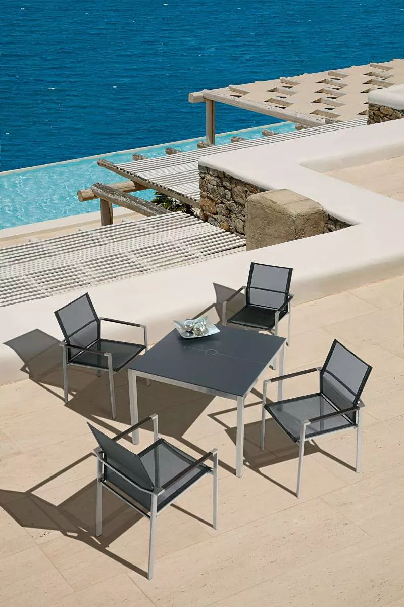 Das Synthetikgewebe ist besonders witterungsbeständig, UV-beständig und reißfest. Es bietet zusätzlich einen hervorragenden Sitzkomfort und ist extrem pflegeleicht.