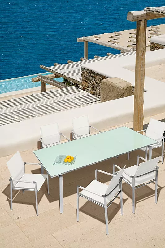 Das Synthetikgewebe ist besonders witterungsbeständig, UV-beständig und reißfest. Es bietet zusätzlich einen hervorragenden Sitzkomfort und ist extrem pflegeleicht.