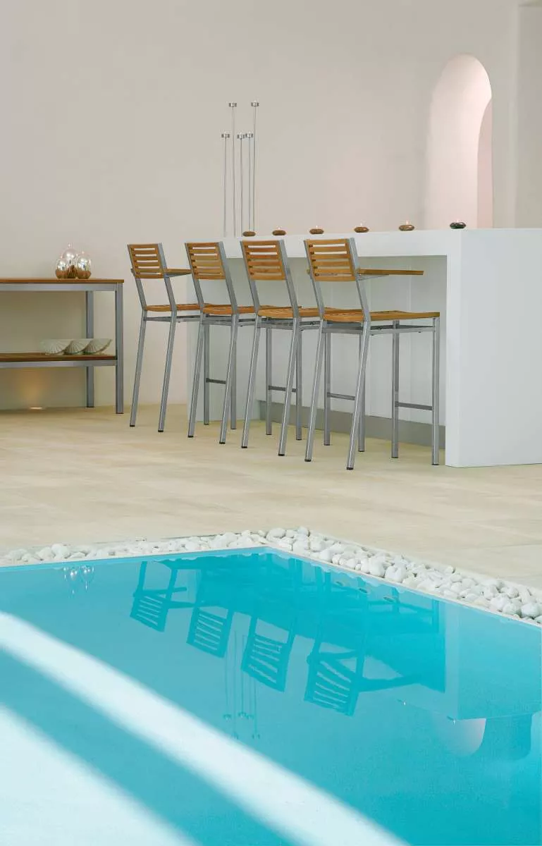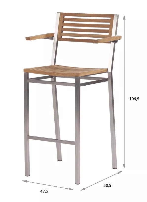 Ein Gestell aus Edelstahl und Arm-/Rückenlehnen aus hochwertigem Teakholz ndiesen Bar- Stuhl von Barlow Tyrie aus.