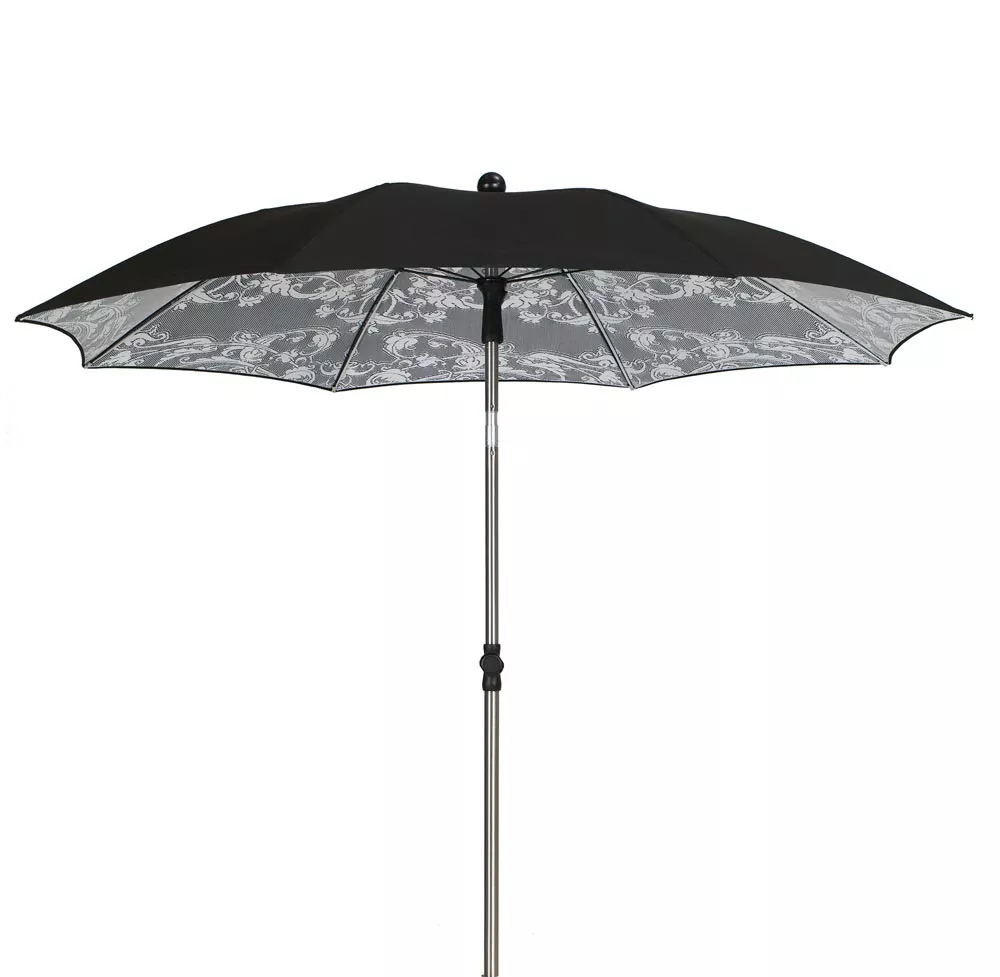 Sonnenschirm mit Edelstahl Schirmgestell gebürstet mit 8 Stahlstreben. Die außere Schirmbespannung besteht aus Symacryl (100% Acrylgewebe) die innere aus Polyester-Spitzenstoff.