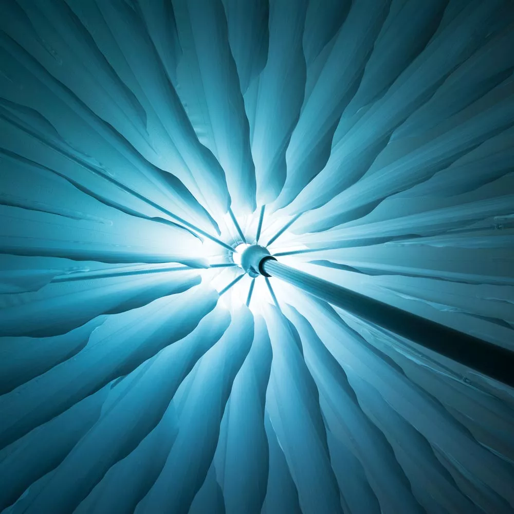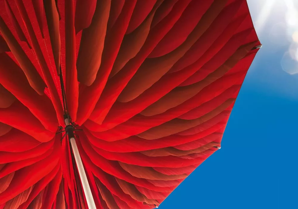Die Schirmbespannung besteht aus Sunbrella® (100% Acrylgewebe) mit Polyester-Fahnen