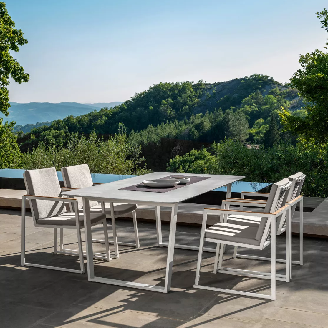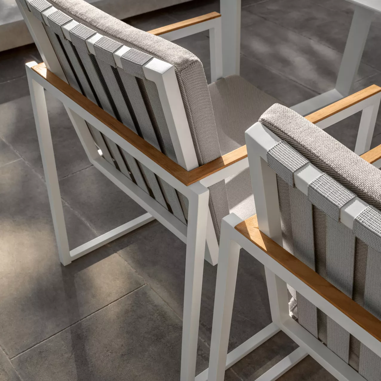 Das Gestell ist aus pulverbeschichtetem Aluminium, das in den Farben White und Graphite erhältlich ist. Die Polster sind aus schnell trocknendem "Quick Dry" Schaumstoff und kommen in der passenden Stoff- und Gurtfarbe. Die Armlehnen sind aus edlem Teakholz beschlagen, der Bezug der Polster ist abziehbar, wetterresistent und waschbar.