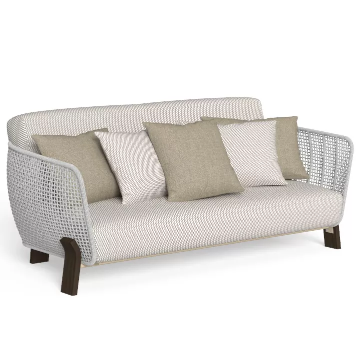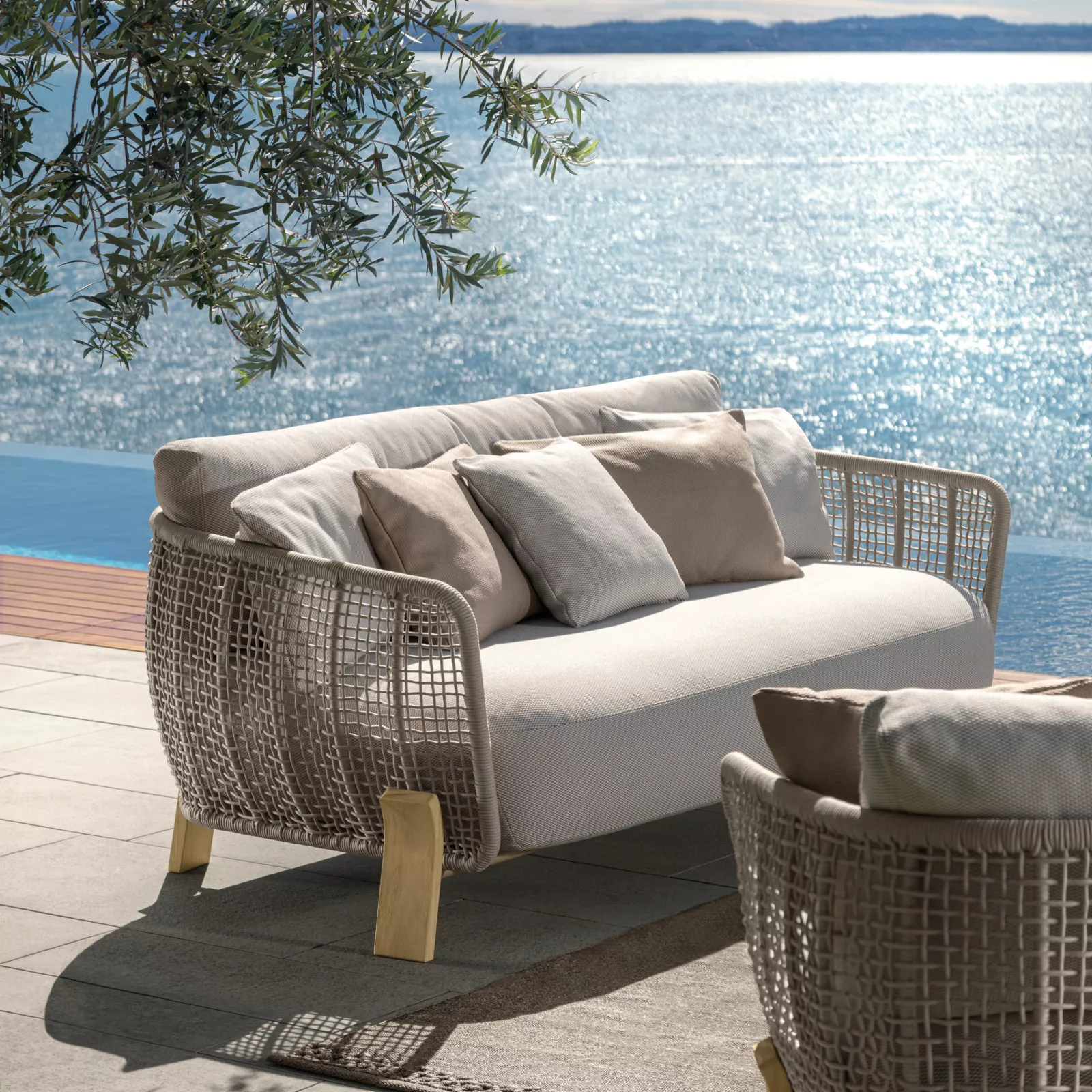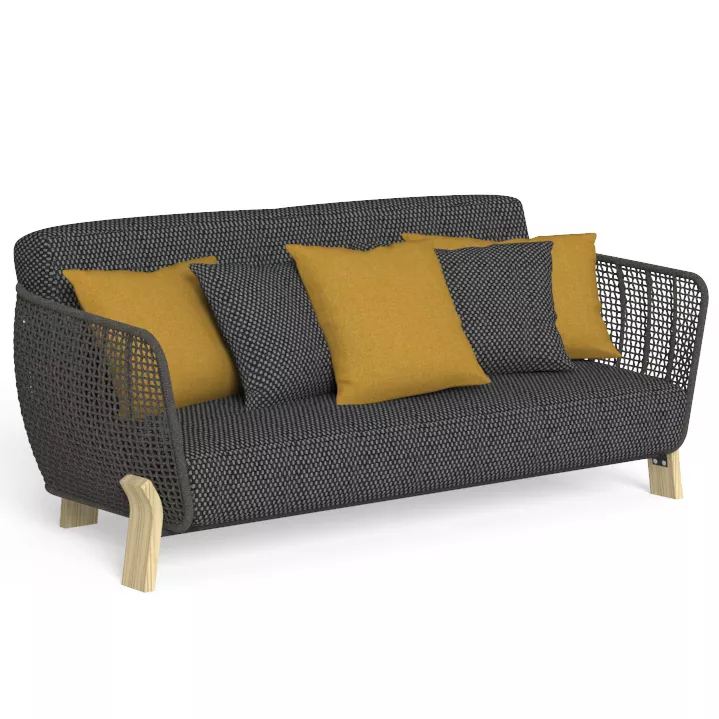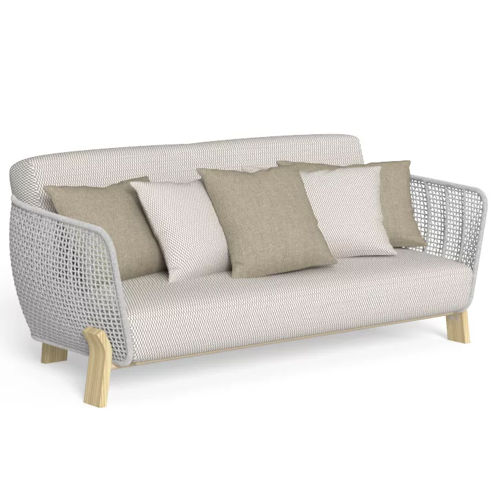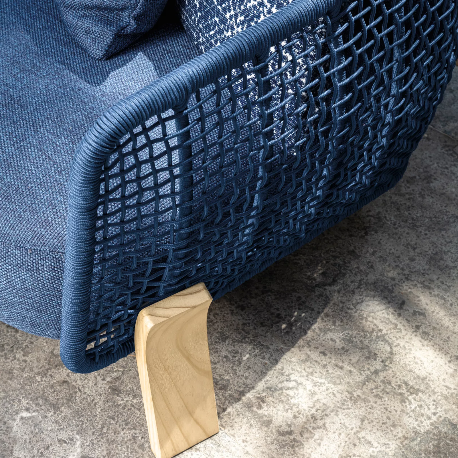 Die Füße des Sofas sind aus Accoya-Holz gefertigt, die Rückenlehne aus Aluminiumgestell ist mit einem systhetischen Seil, das farblich zur Stoffauswahl passt, bespannt.