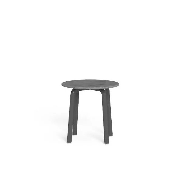 Beim runden Kaffeetisch Ø 50 cm der Outdoor-Kollektion Cleo Alu wird das Gestell aus pulverlackiertem Aluminium je nach Farbe mit unterschiedlichen Tischplatten kombiniert: bei der weißen Ausführung kommt eine hellgraue, 12 mm dicke Fiberzementplatte zum Einsatz; eine dunkelgraue, 12 mm dicke Platte aus dem gleichen Material begleitet das graphitfarbene Gestell.