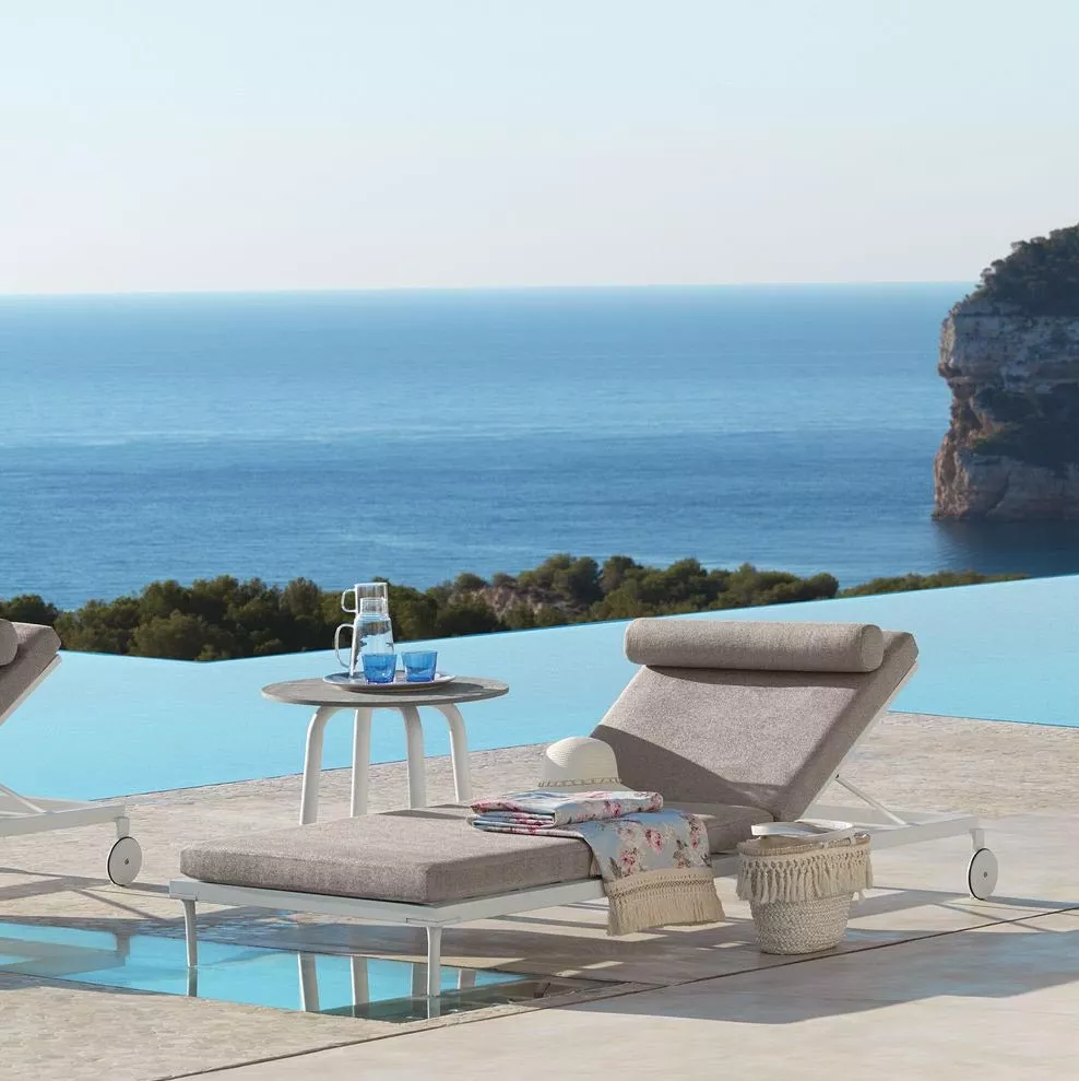 Leitfaden der Kollektion Cleo Alu ist der Wunsch, ein junges, dynamisches Produkt zu kreieren, das in der Lage ist, den Betrachter emotionell anzusprechen, wobei die visuelle Wahrnehmung direkt auf die Gefühle wirkt. Diese Kollektion entsteht aus der Lust, mit Kontrasten und neuen Materialkombinationen zu spielen und zu experimentieren: die Leichtigkeit des Aluminiums, aktuelle zementgebundene Oberflächen zusammen mit der überraschenden Eleganz der Textilbespannungen schaffen eine Linie, die sich perfekt jedem Stil und jedem Bereich im Freien anpasst. Die lebhaften Farben und die tiefen Sitzflächen vermitteln gute Stimmung und Relax. Eine schicke, trendy Kollektion, frisch und fröhlich, für ein junges und junggebliebenes Publikum.