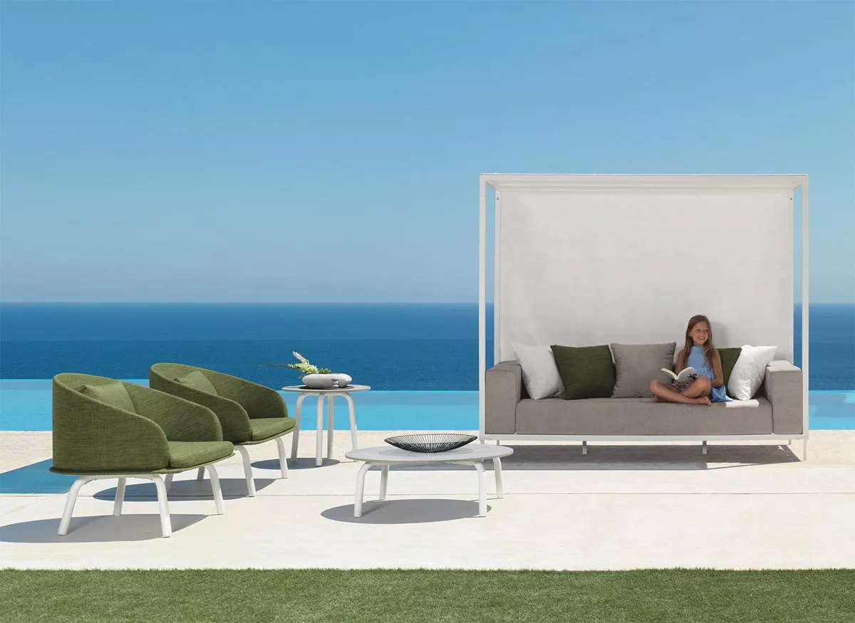 Der 3-Sitzer Cleo Alu für den Außenbereich vereint in sich die charakteristischen Markenzeichen der gesamten Kollektion: Volumen, Form und Gleichgewicht. Die Polster der voluminösen Sitz- und Rückenpolster sind abziehbar, leicht zu reinigen und witterungsbeständig.