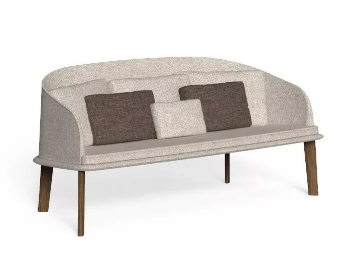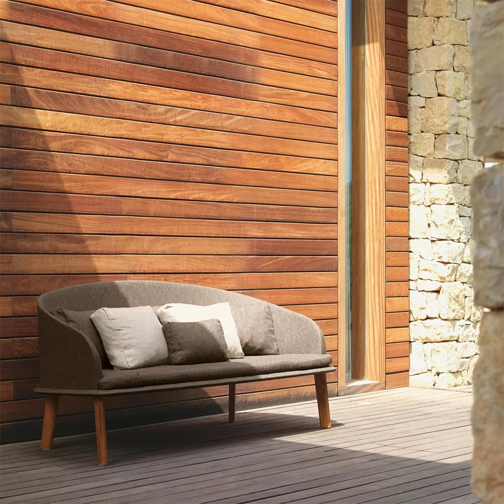 Der 3-Sitzer Cleo Teak für den Außenbereich vereint in sich die charakteristischen Markenzeichen der gesamten Kollektion: Volumen, Form und Gleichgewicht. Die Polster der voluminösen Sitz- und Rückenpolster sind abziehbar, leicht zu reinigen und witterungsbeständig.