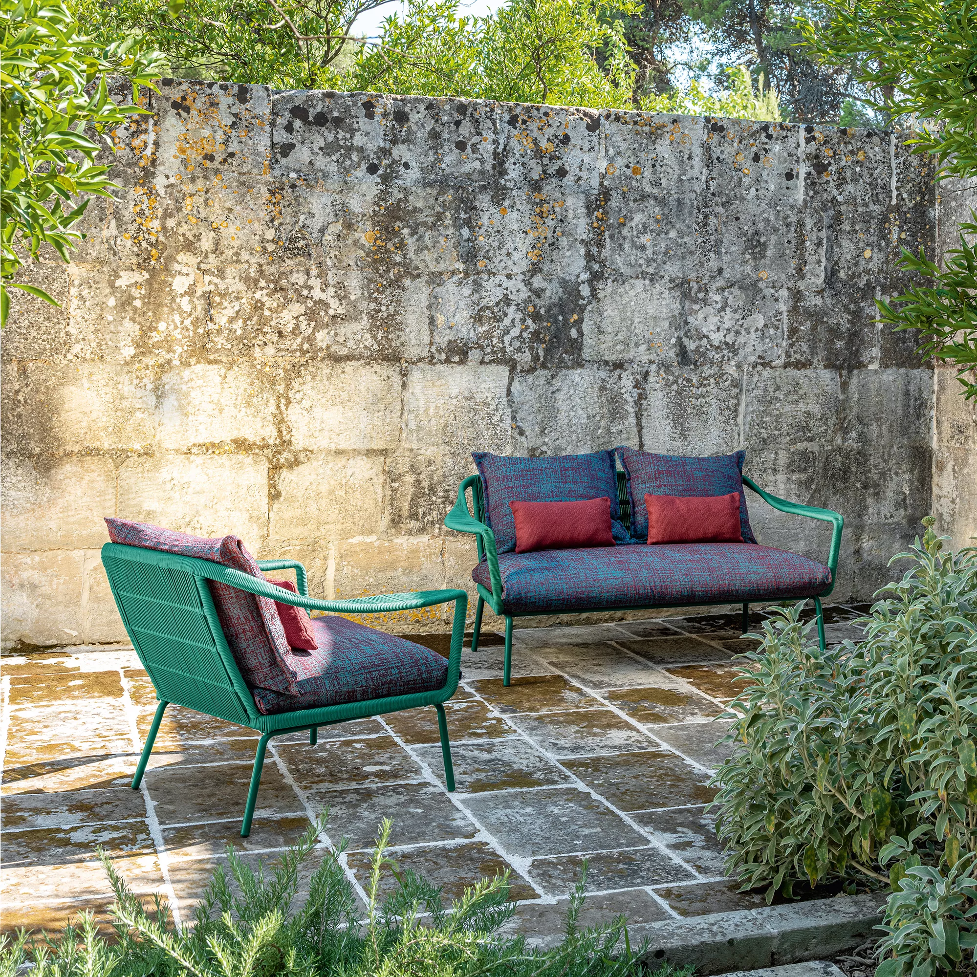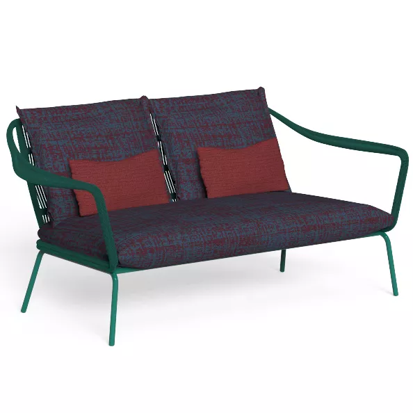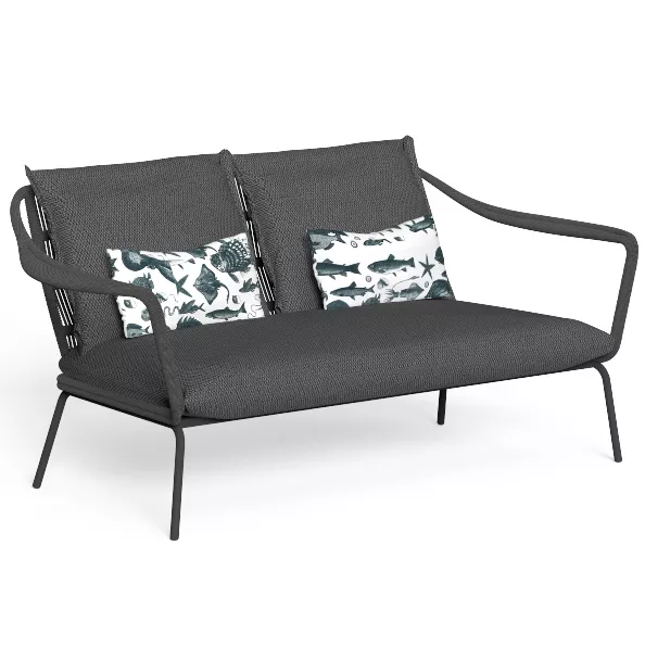 Das Cruise Alu Sofa ist aus einem pulverbeschichteten Aluminiumrahmen und die Polster sind aus abziehbarem, schnell trocknendem Schaumstoff gefertigt. Die Rücken- und Armlehnen sind mit einem synthetischen Seil bespannt, das der Kollektion seinen besonderen Ausdruck verleiht.