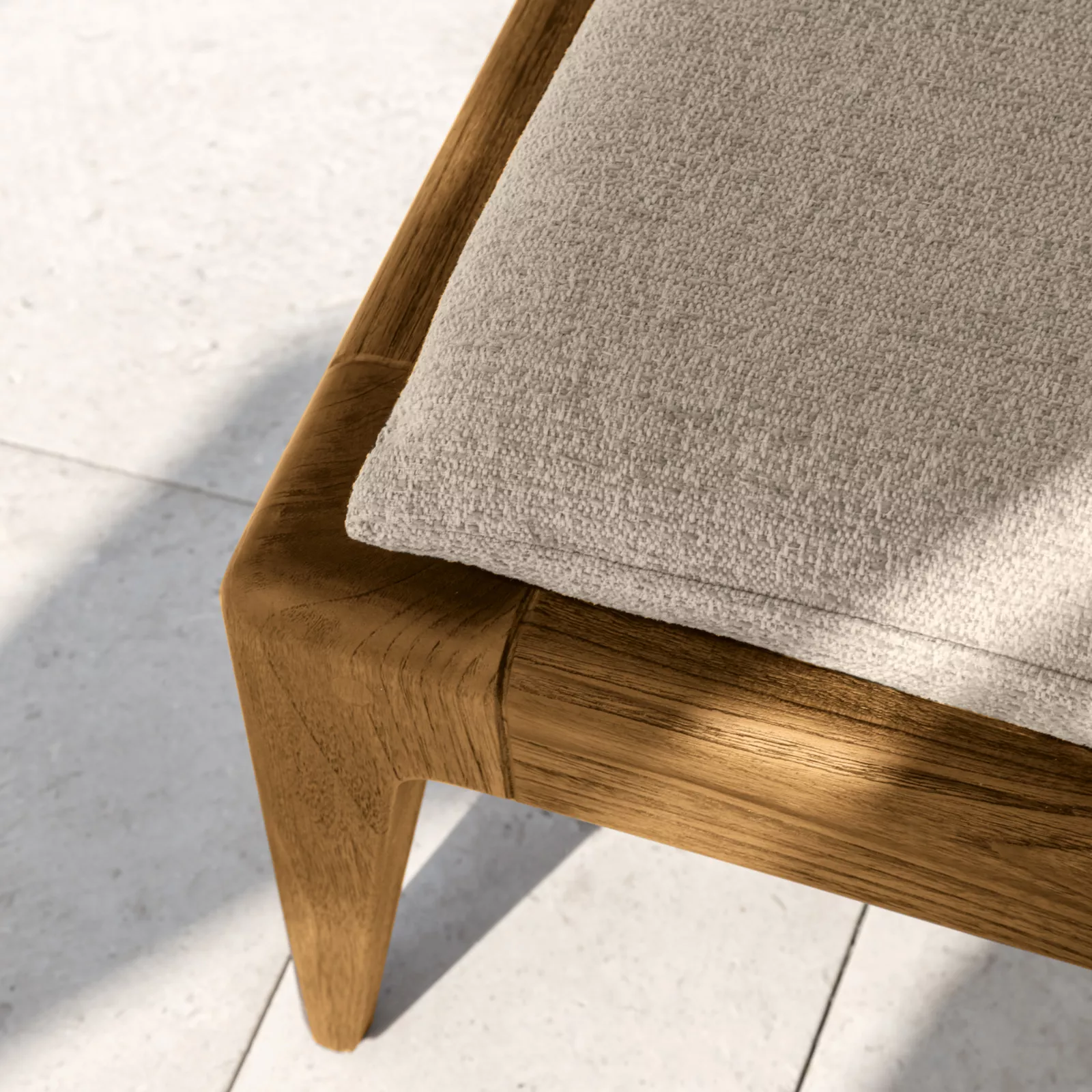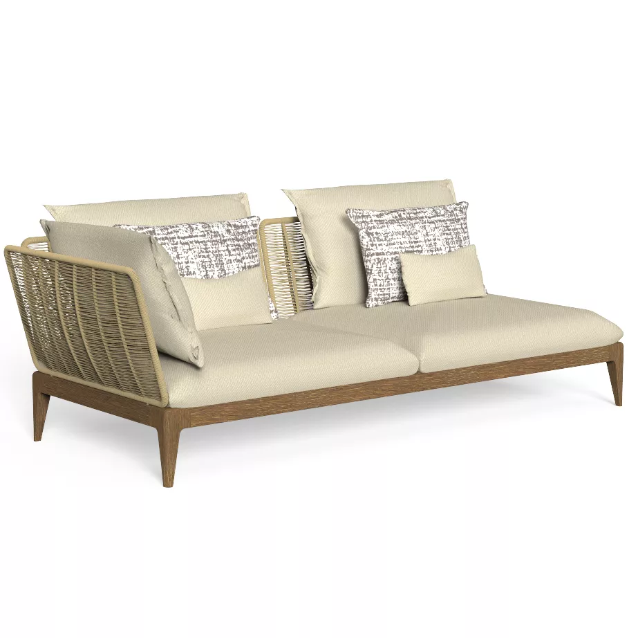 Das Cruise Loungemodul zeichnet sich durch ein hochwertiges Teakholzgestell aus. Die Schaumstoffpolster sind aus einem schnell trocknenden Material und die Bezüge lassen sich problemlos abziehen. Die Rücken- und Armlehnen sind mit einem synthetischen Seil bespannt, das der Kollektion seinen besonderen Ausdruck verleiht.