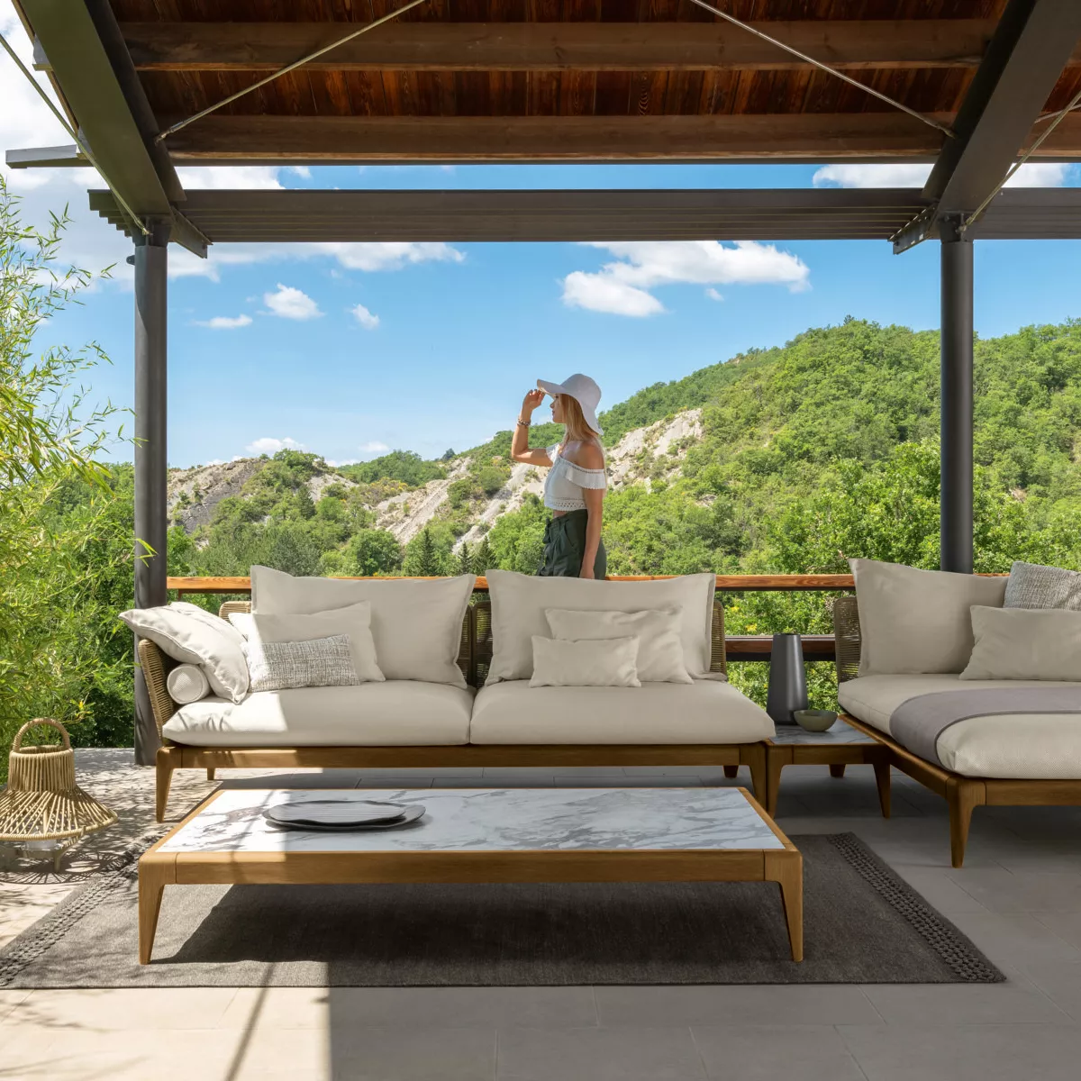 Das Cruise Loungemodul zeichnet sich durch ein hochwertiges Teakholzgestell aus. Die Schaumstoffpolster sind aus einem schnell trocknenden Material und die Bezüge lassen sich problemlos abziehen. Die Rücken- und Armlehnen sind mit einem synthetischen Seil bespannt, das der Kollektion seinen besonderen Ausdruck verleiht.