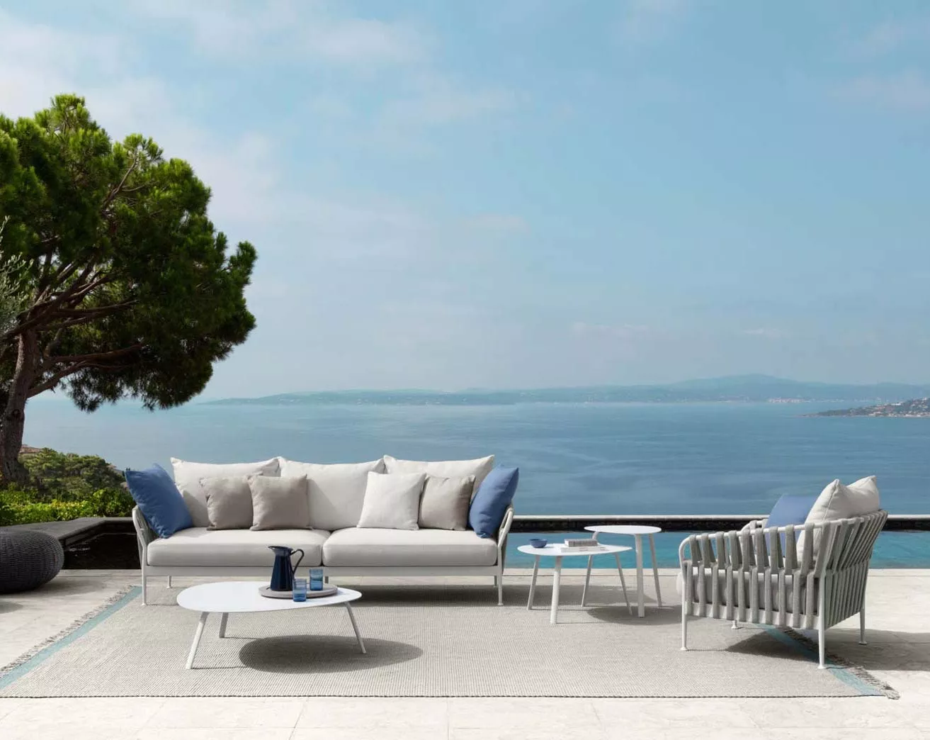 Die Talenti Frame Kollektion zeichnet sich durch die kreative Verbindung von Aluminiumgestell, Seilgeflecht und bequemen Kissen aus. Das Seilgeflecht auf dem Rohrgestell schafft ein Netzmuster, das faszinierende Lichtspiele erzeugt, wenn sich die Strahlen auf den Spalten niederlegen. Leichte und sinnliche Gartenmöbel für perfekte Entspannung im Freien in einem perfekten, modernen Look.